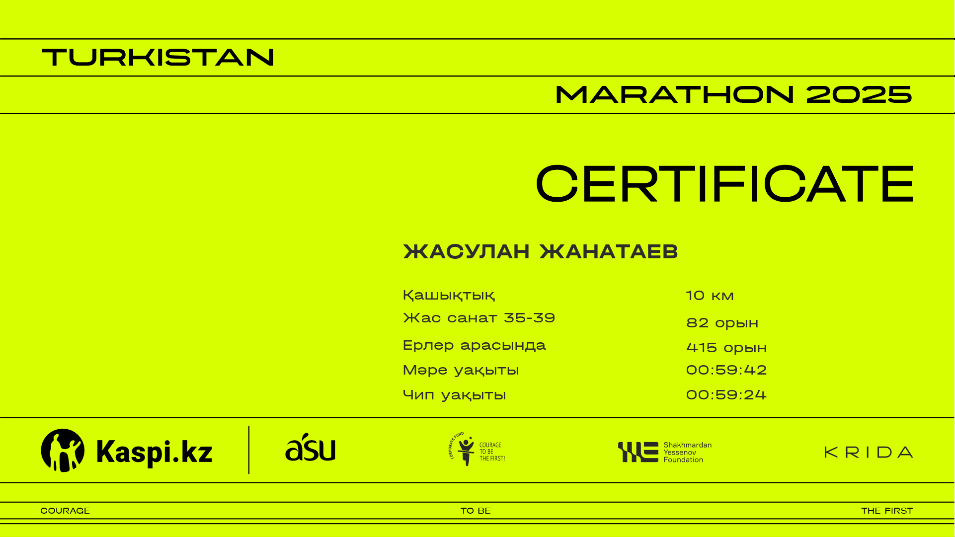 | 603 | Abylaikhan Abishov | ![]() | Шымкент | 1977 | 00:37:36 | 01:00:42 | 00:59:59 | Жүктеп алу |
