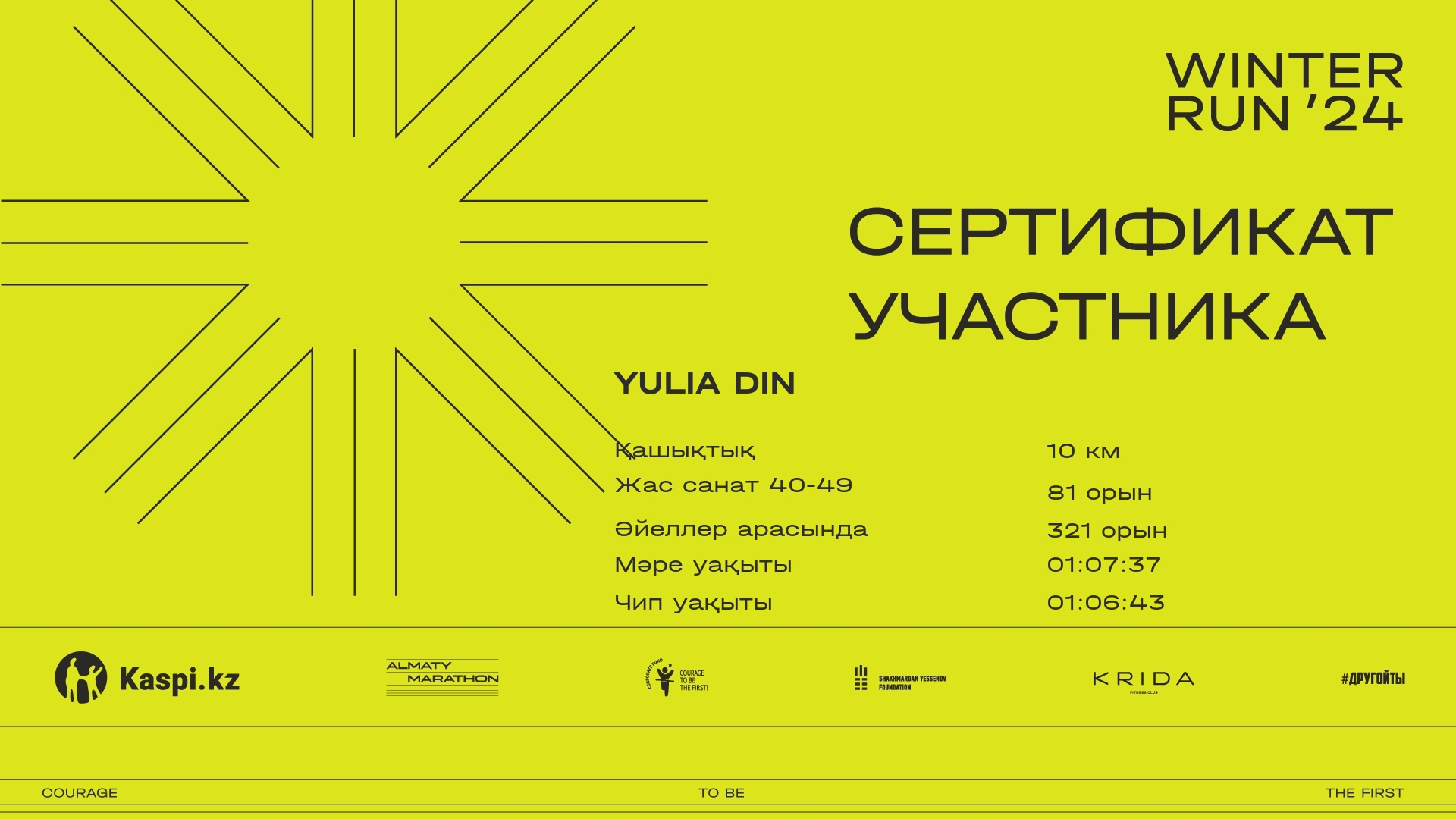 | 1739 | Жазира Джаболдинова | ![]() | Алматы | 1884 | 00:13:40 | 00:44:45 | 01:12:45 | 01:26:21 | 01:25:26 | Жүктеп алу |