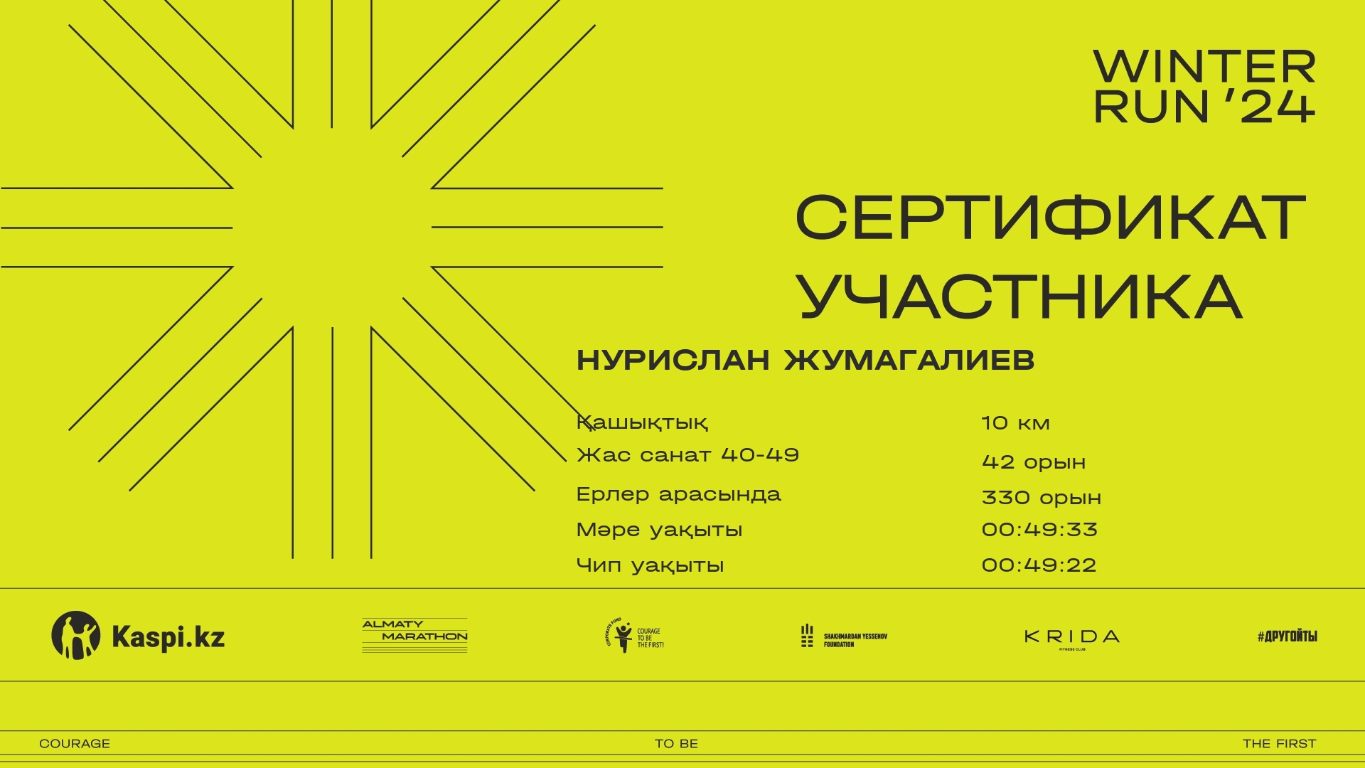 | 369 | Нурислан Жумагалиев | ![]() | Алматы | 1922 | 00:07:08 | 00:25:39 | 00:41:35 | 00:49:33 | 00:49:22 | Жүктеп алу |