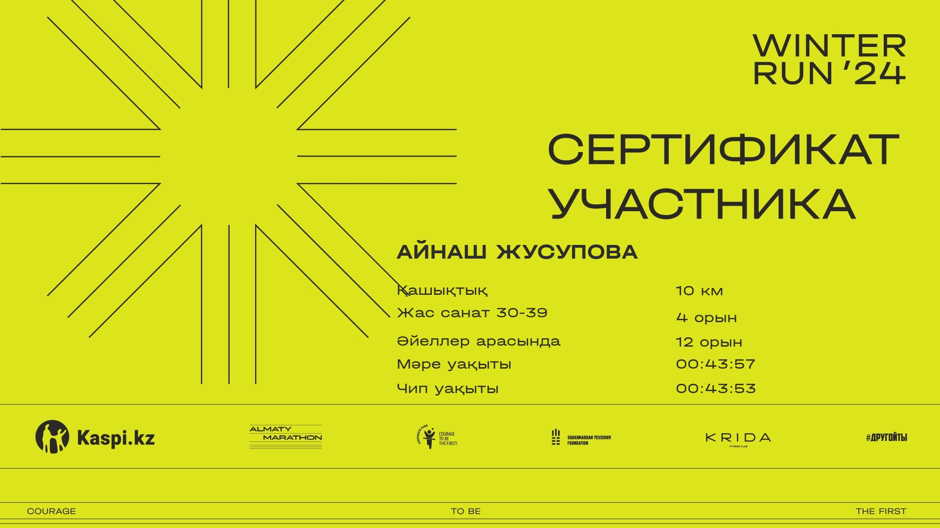| 167 | Айнаш Жусупова | ![]() | Алматы | 1035 | 00:06:22 | 00:22:20 | 00:37:02 | 00:43:57 | 00:43:53 | Жүктеп алу |