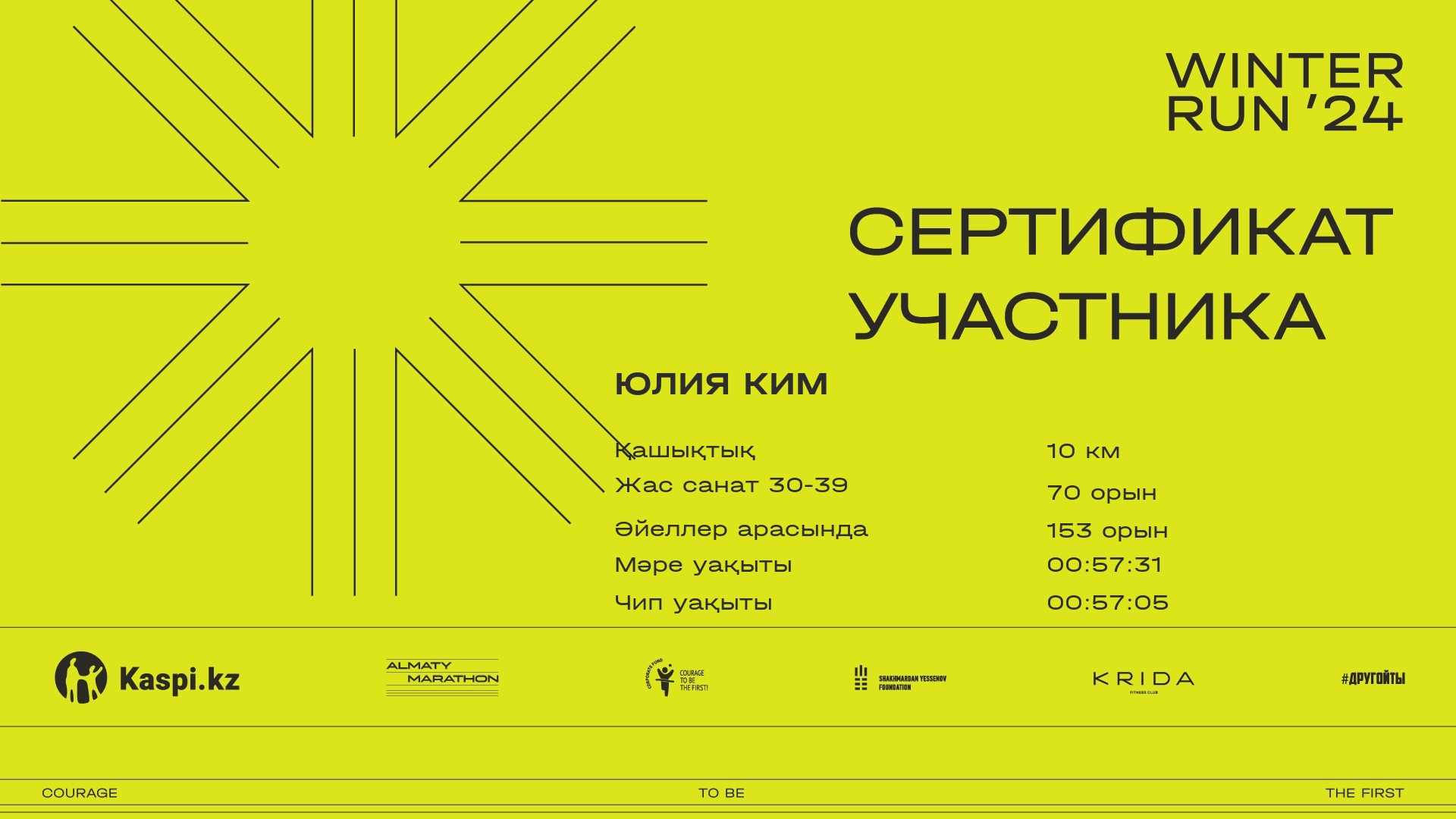 | 833 | Юлия Ким | ![]() | Алматы | 1367 | 00:08:45 | 00:29:36 | 00:48:20 | 00:57:31 | 00:57:05 | Жүктеп алу |