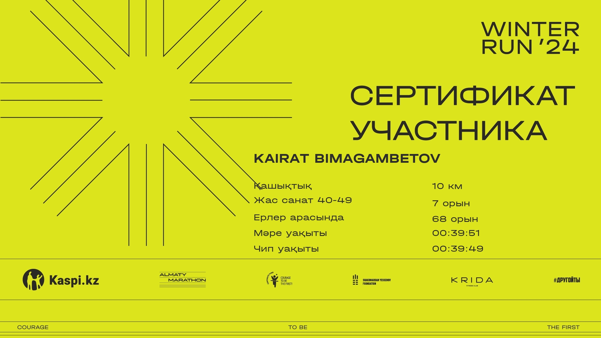 | 73 | Kairat Bimagambetov | ![]() | Алматы | 1713 | 00:05:53 | 00:20:47 | 00:33:38 | 00:39:51 | 00:39:49 | Жүктеп алу |