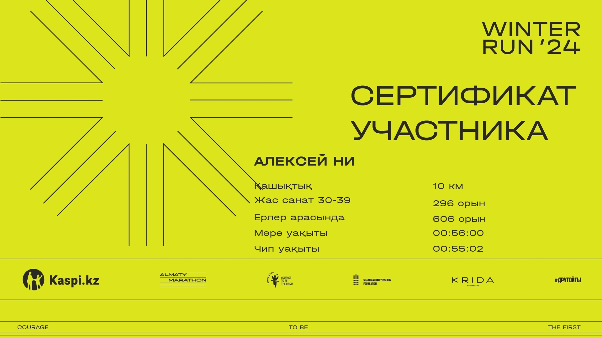 | 1264 | Алина Ибрагимова | ![]() | Алматы | 621 | 00:09:51 | 00:35:17 | 00:55:46 | 01:06:50 | 01:06:10 | Жүктеп алу |