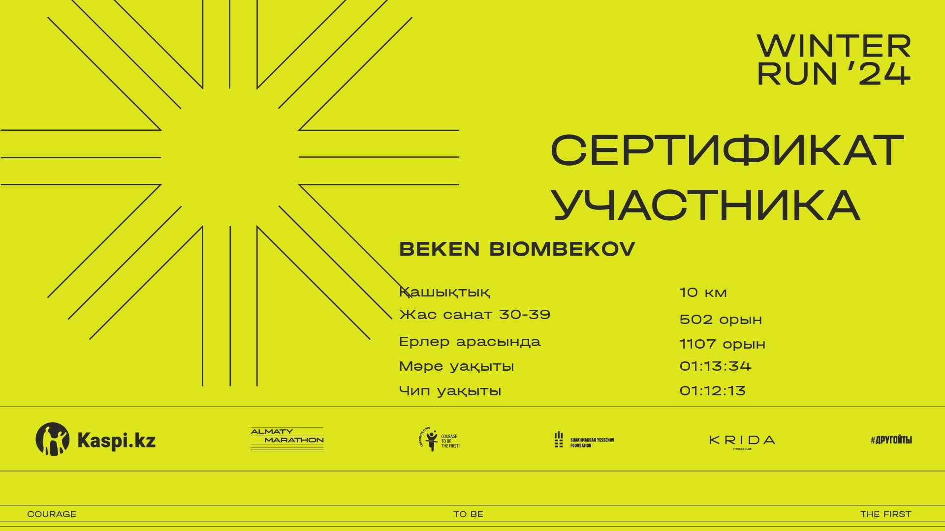 | 1041 | Beibarys Galyam | ![]() | Almaty | 301 | 00:09:15 | 00:34:07 | 00:52:30 | 01:01:34 | 01:00:59 | Жүктеп алу |