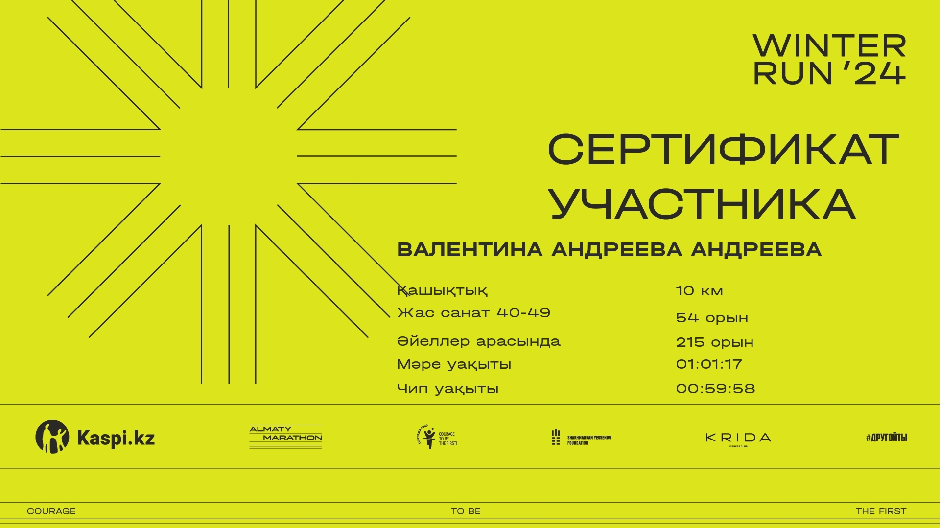 | 1734 | Камила Кыдыргажи | ![]() | Алматы | 614 | 00:11:50 | 00:43:03 | 01:12:40 | 01:26:00 | 01:25:08 | Жүктеп алу |