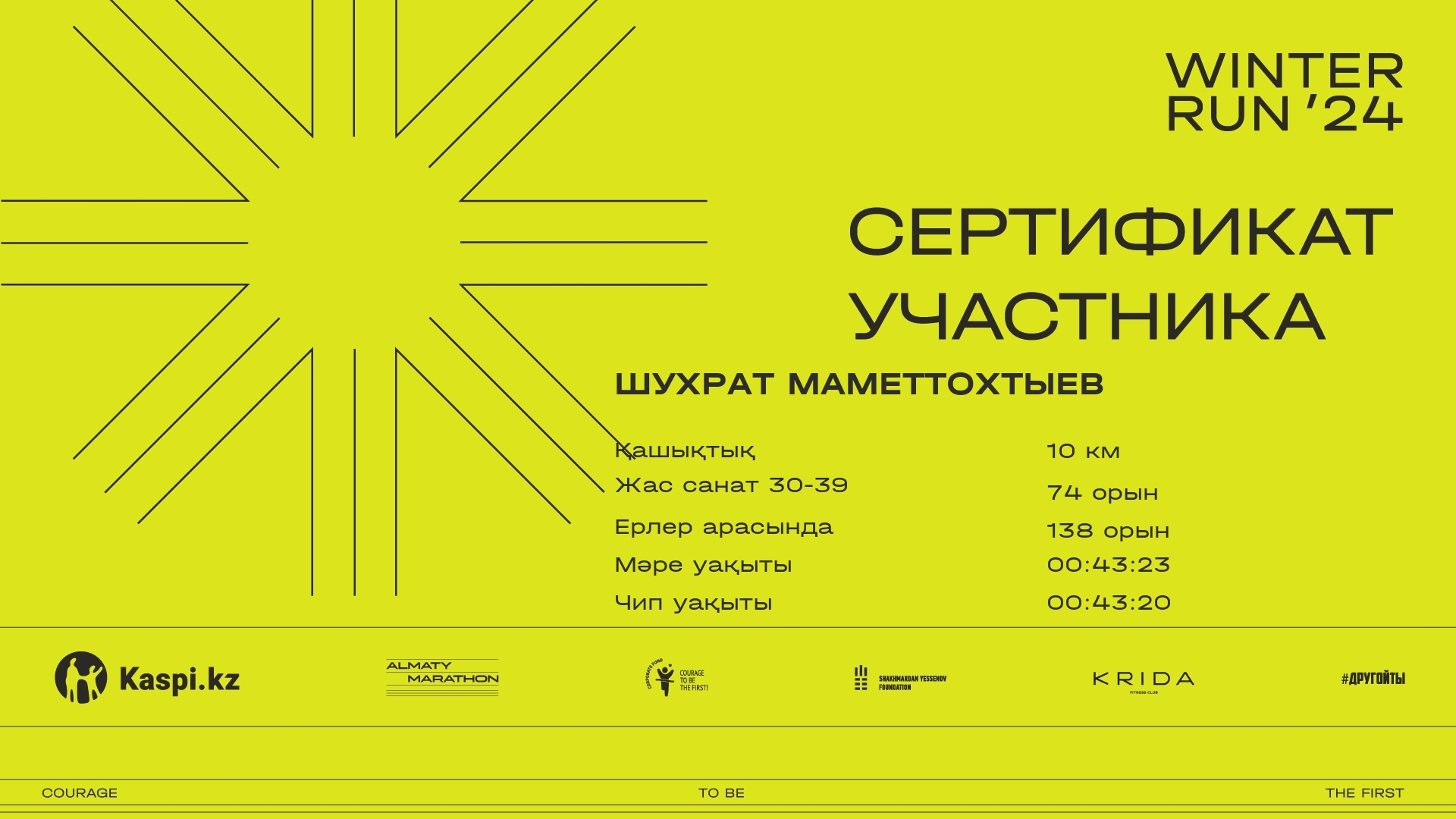 | 1314 | Шынғыс Бақтыбаев | ![]() | Алматы | 594 | 00:09:30 | 00:33:13 | 00:54:41 | 01:07:58 | 01:07:22 | Жүктеп алу |