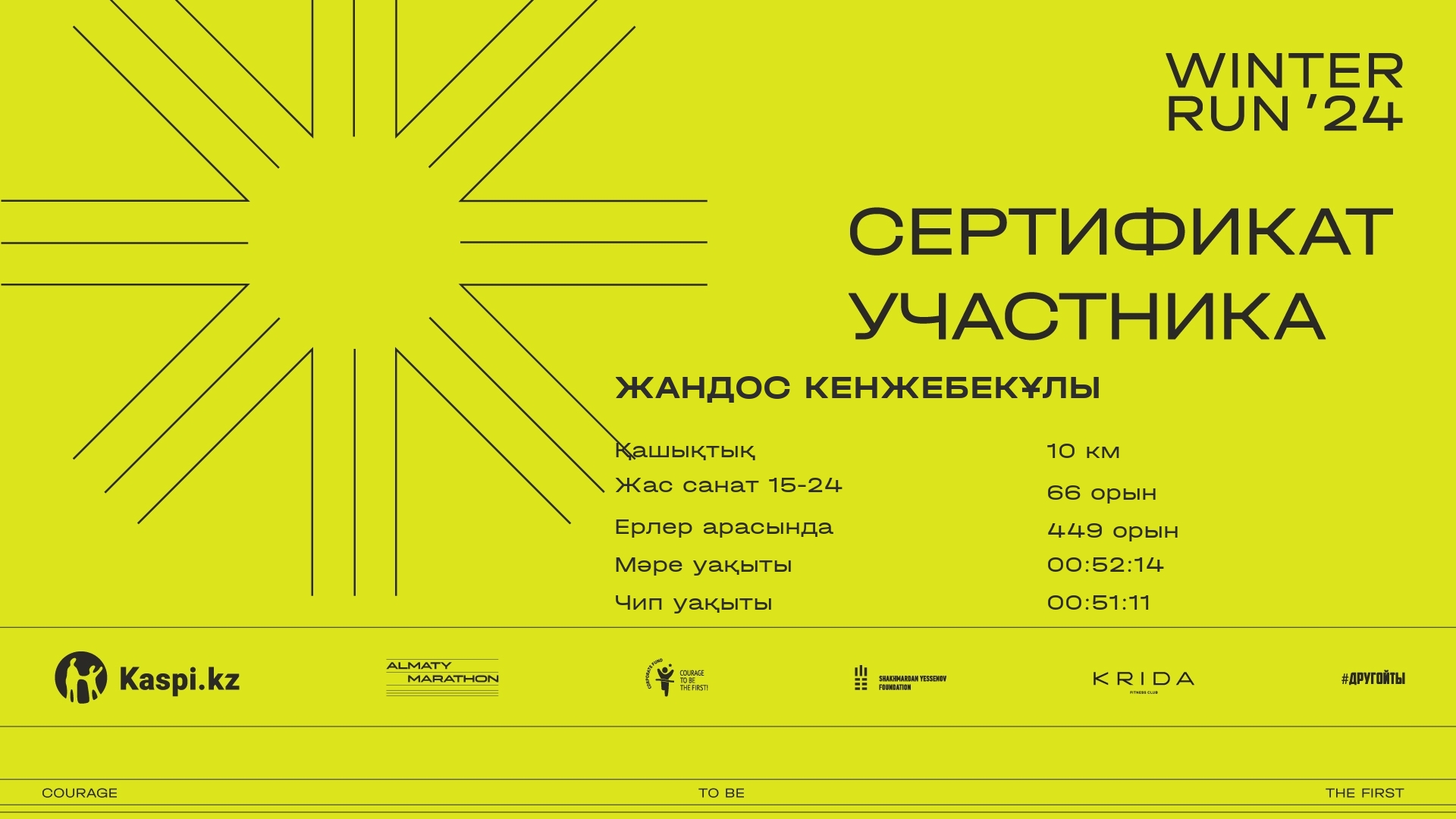 | 1711 | Арман Турлыбек | ![]() | Алматы | 232 | 00:10:00 | 00:39:07 | 01:10:30 | 01:23:21 | 01:22:11 | Жүктеп алу |