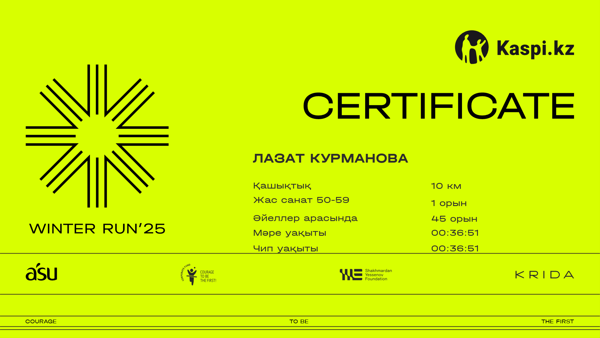 | 333 | Лазат Курманова | ![]() | Алматы | 1688 | 00:21:18 | 00:36:51 | 00:50:48 | 00:50:22 | Жүктеп алу |