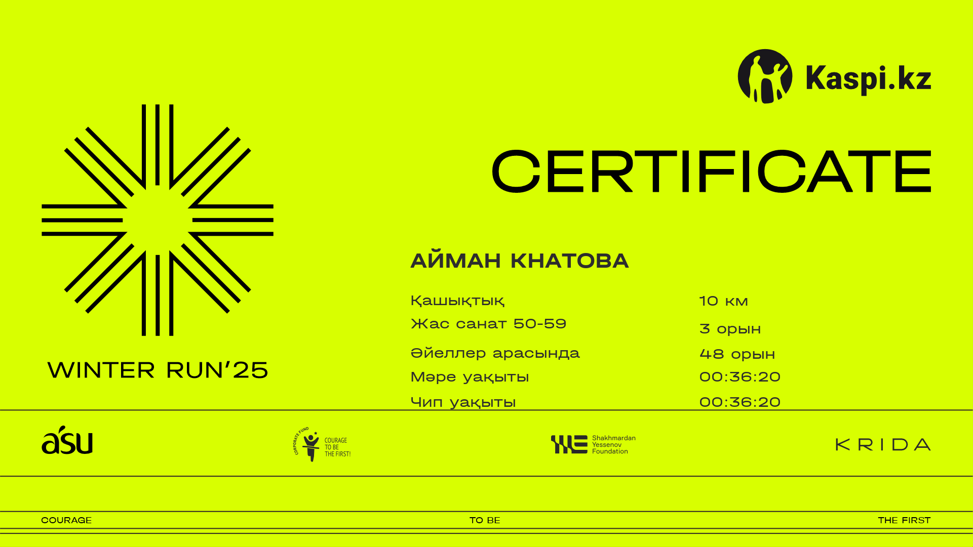 | 357 | Айгерим Каримова | ![]() | Алматы | 195 | 00:22:00 | 00:37:39 | 00:50:57 | 00:50:50 | Жүктеп алу |
