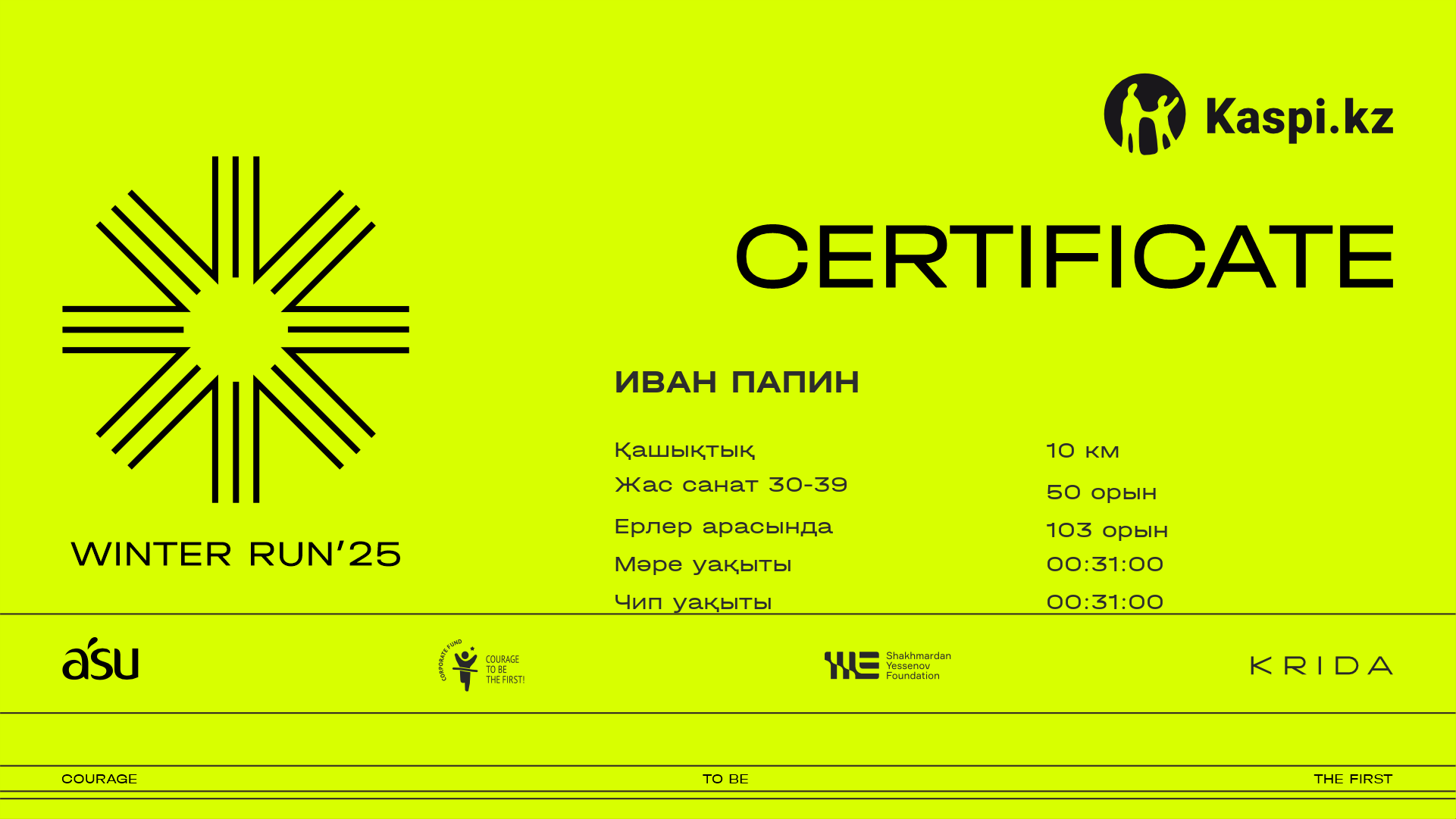| 110 | Ризабек Жумадилов | ![]() | Усть-Каменогорск | 802 | 00:17:08 | 00:30:54 | 00:42:57 | 00:42:55 | Жүктеп алу |
