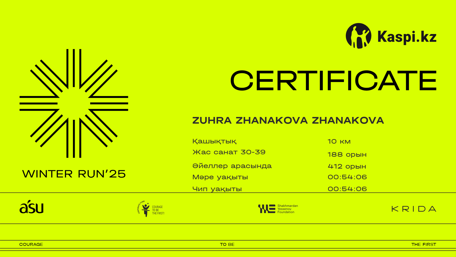 | 1325 | Orynbassar Tumenbayeva | ![]() | Алматы | 522 | 00:30:06 | 00:54:44 | 01:14:11 | 01:13:33 | Жүктеп алу |