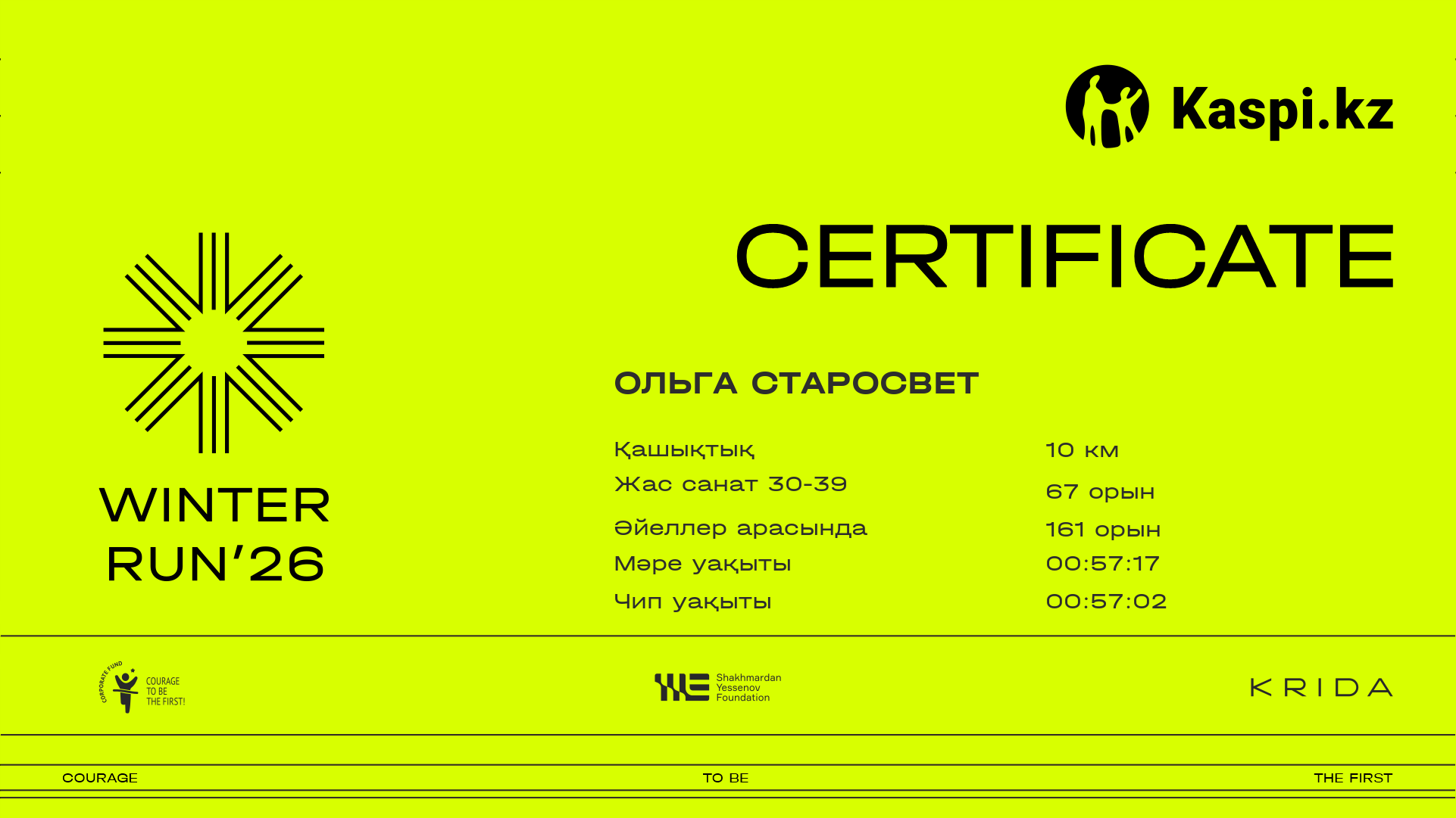 | Орын | Қатысушы | Ел | Қала | Нөмір | 1.5 km | 5 km | 8.5 km | Финиш | Уақыт чипі | Сертификат |