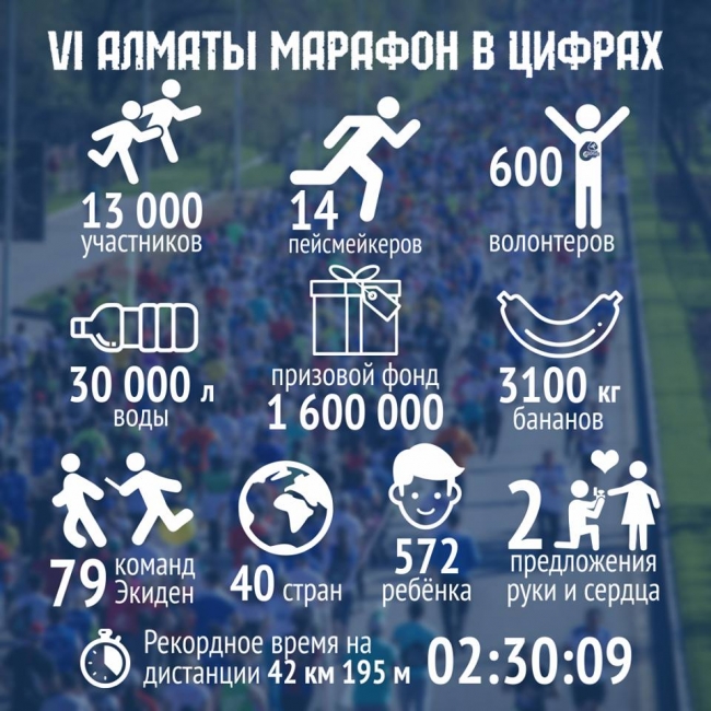 Впервые за всю историю проведения Алматы Марафона с 2012 года, был установлен рекорд по времени преодоления марафонской дистанции, который принадлежит Николаю Григорову – 02:30:09. 24 человека преодолели марафон менее, чем за три часа.