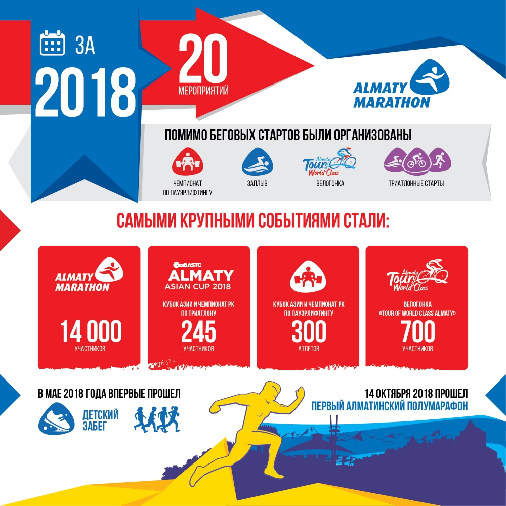 Самое крупное беговое мероприятие Центральной Азии «Алматы марафон» собрало в этом году более 14 000 участников из 38 стран. В Кубке Азии и Чемпионате Казахстана по триатлону в августе, участвовало 245 спортсменов. Еще 300 атлетов соревновались за звание лучшего на Кубке Азии и Чемпионате страны по пауэрлифтингу в мае. Велогонка «Tour of World Class Almaty» собрала более 700 любителей этого вида спорта в конце лета. В первом детском забеге участвовало 300 малышей в возрасте от 3 лет. А впервые прошедший Алматинский полумарафон пробежали около 4000 спортсменов-любителей. Суммарно во всех спортивных мероприятиях фонда в этом году приняло участие более 25 00 казахстанцев.