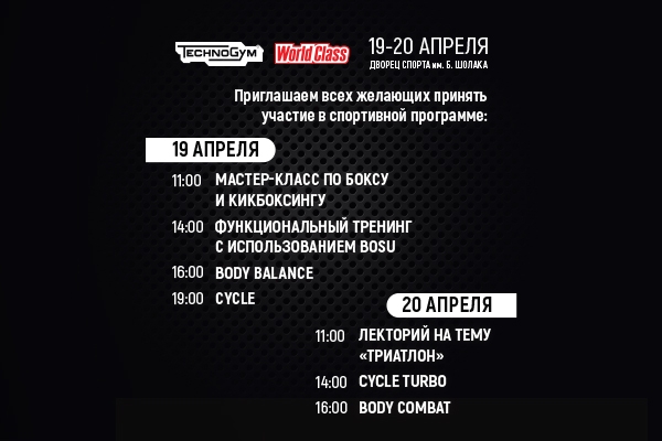Давно хотели попробовать взрывные программы от World Class Almaty? 19 и 20 апреля на Спортивной ярмарке «Алматы марафона» у вас будет такая возможность! Берите с собой спортивную форму и полотенца, присоединяйтесь и заряжайтесь яркими эмоциями и позитивным настроением от высокопрофессиональных тренеров фитнес-клуба World Class Almaty перед «Алматы марафоном»!