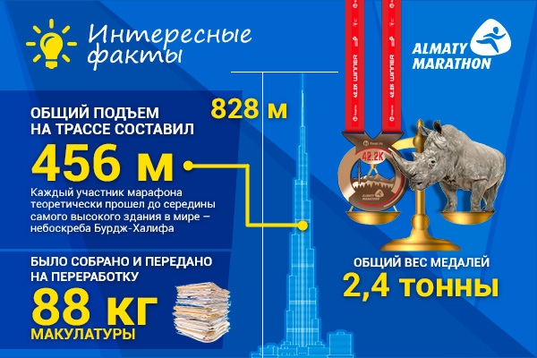 - Общий вес медалей, заказанных для «Алматы марафона» 2019 составил 2,4 тонны. Это вес примерно двух самок бегемота или одного белого носорога.