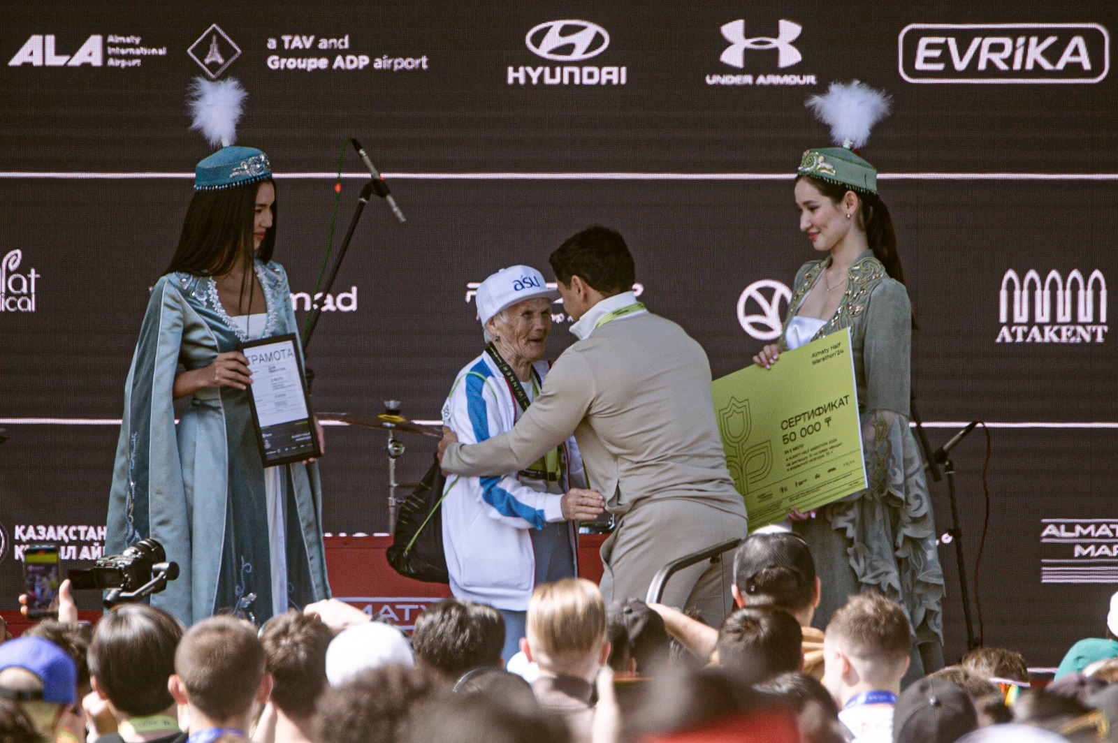 В самом начале на сцену пригласили самую опытную участницу забега Дузу Мавлютову. Ей 86 лет, но возраст не стал помехой для того, чтобы преодолеть дистанцию и напомнить молодежи, что спорт не имеет возрастных ограничений: «Спорт – дело хорошее». Стоит отметить, что Дуза Мавлютова – регулярно принимает участие в мерпориятиях фонда, традиционно выбирая дистанцию в 10 километров.
