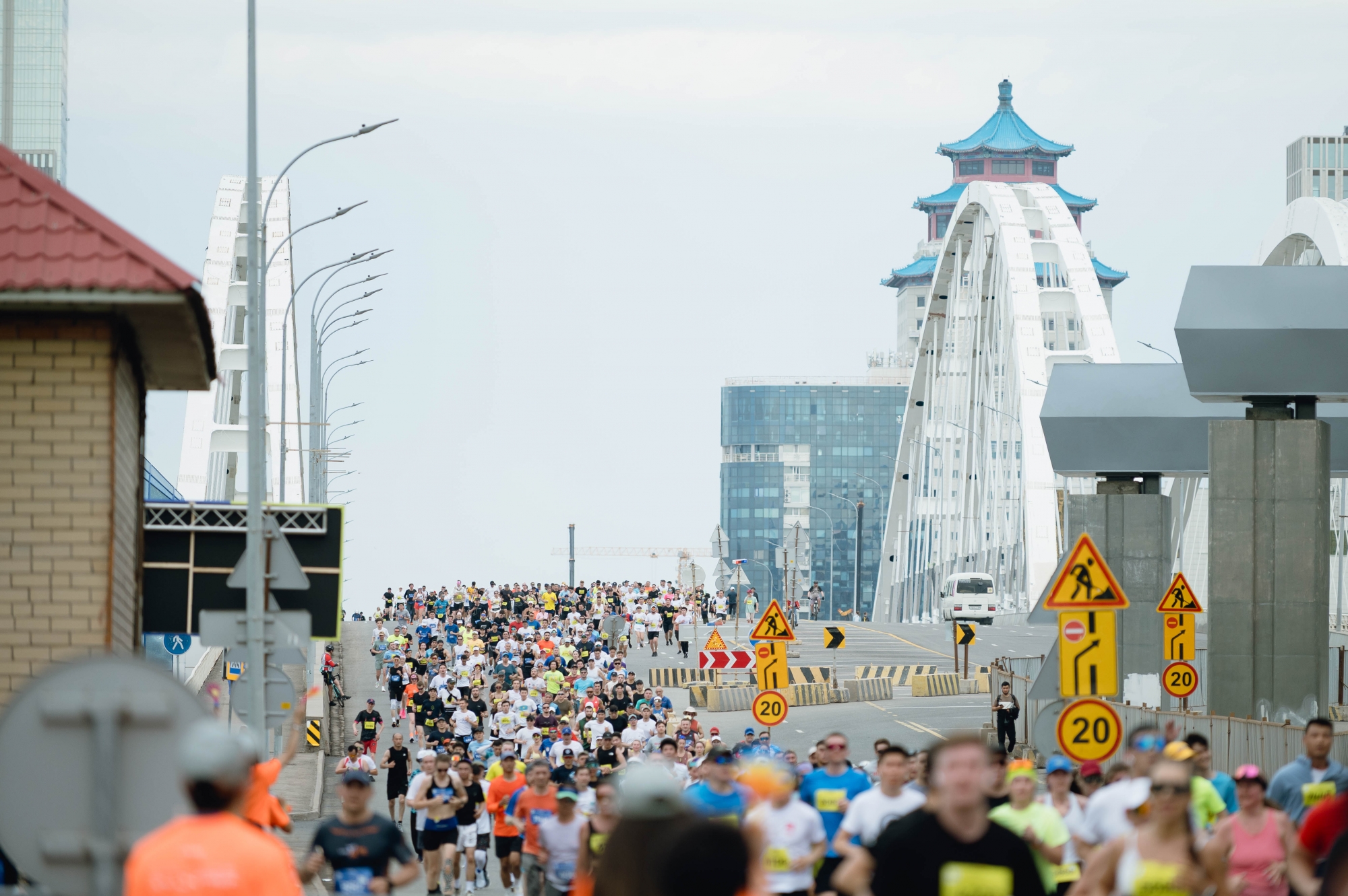 В 7:50 уже все более 6000 участника преодолевают интереснейший маршрут Astana Half Marathon с видами на знаковые достопримечательности столицы — Дворец мира и согласия, резиденция Ақорда, набережная реки Есиль, монумент Байтерек и комплекс Абу-Даби Плаза. Всегда загруженные транспортом столичные проспекты сейчас в распоряжении бегунов, на трассе даже дышится по-другому.
