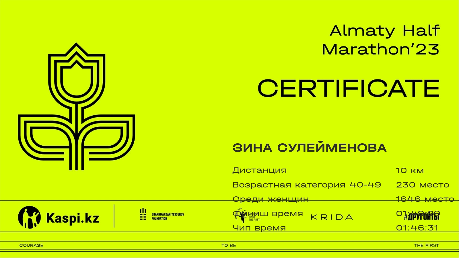 | 3506 | Сания Бакиева | ![]() | Алматы | 5424 | 01:11:14.70 | 01:49:04.29 | 01:48:53.56 | Скачать |