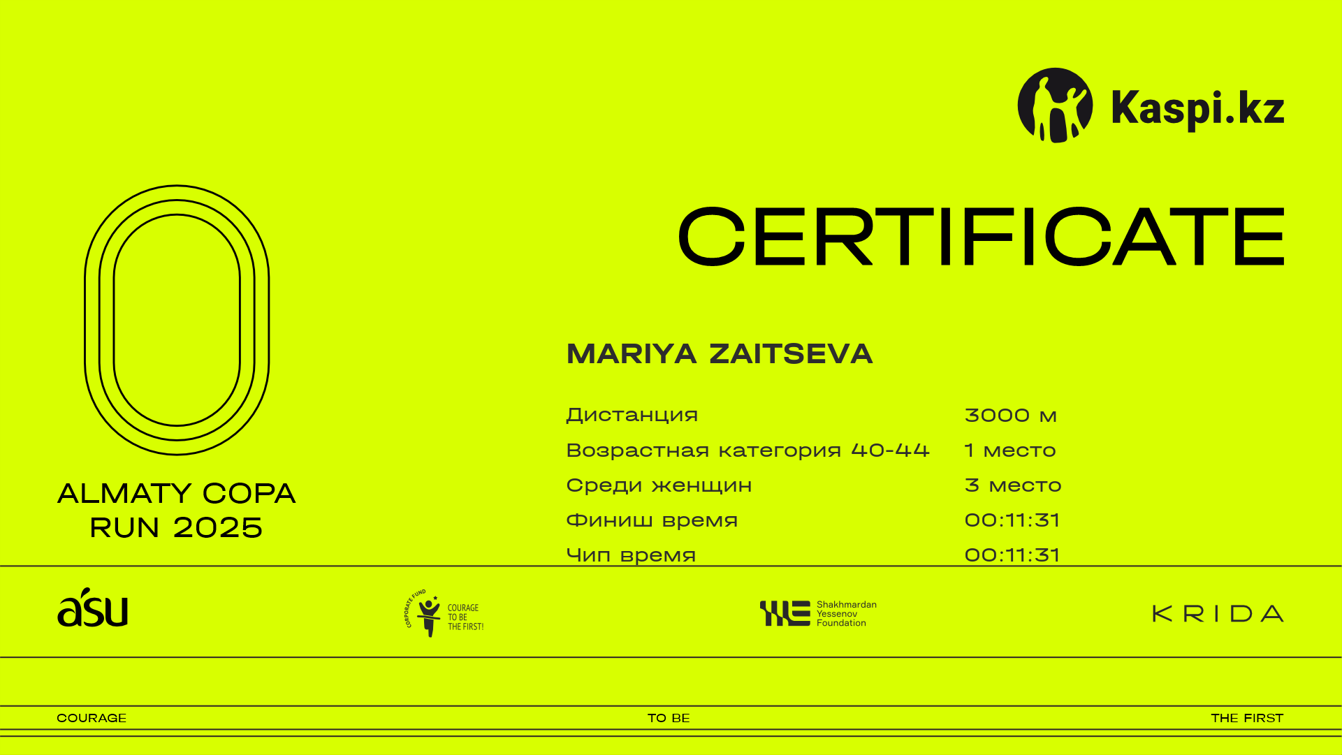 | 43 | Ольга Саупе | ![]() | Алматы | 481 | 00:11:26.50 | 00:11:26.50 | Скачать |