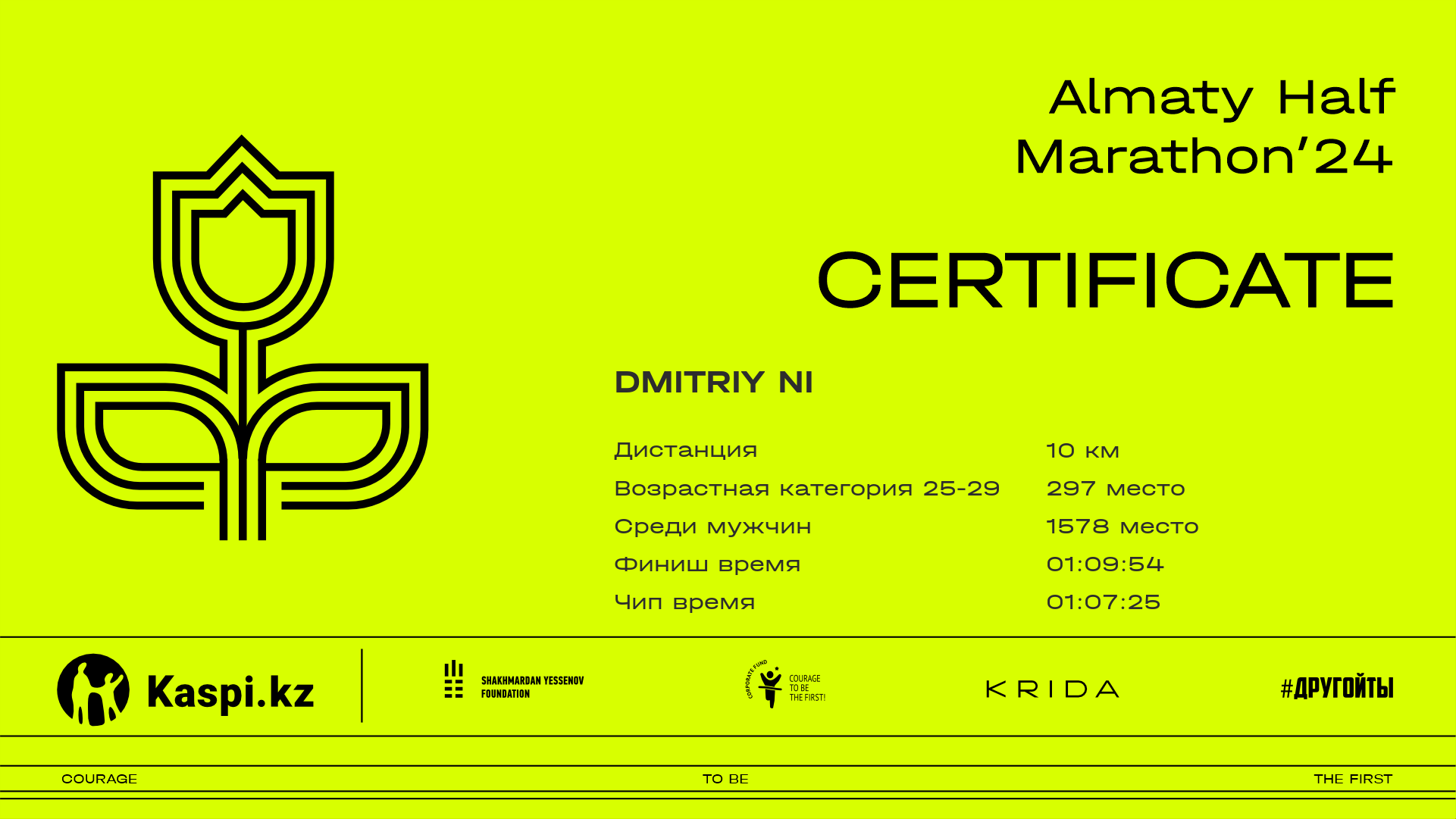 | 2333 | Dmitriy Ni | ![]() | Almaty | 5498 | 00:49:17 | 01:09:54 | 01:07:25 | Скачать |