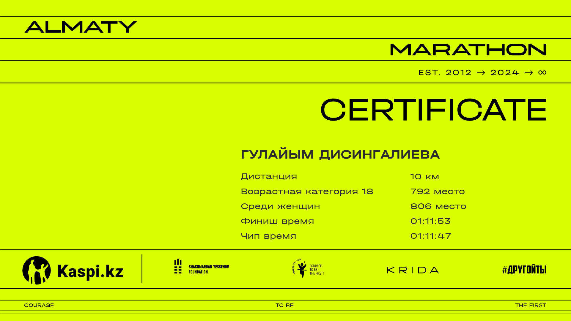 | 4926 | Zhansaya Abildaeva | ![]() | Алматы | 9664 | 01:07:13.29 | 01:31:26.34 | 01:28:16.06 | Скачать |