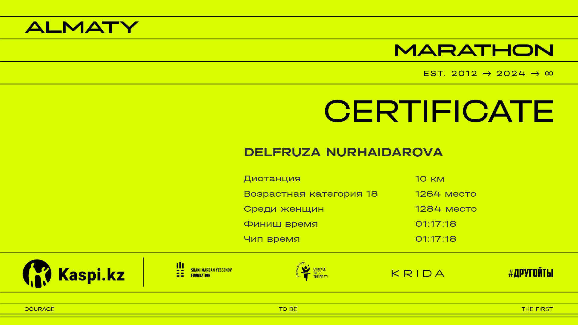 | 4267 | Diana Kim | ![]() | Almaty | 9271 | 01:00:19.94 | 01:23:14.40 | 01:20:07.78 | Скачать |