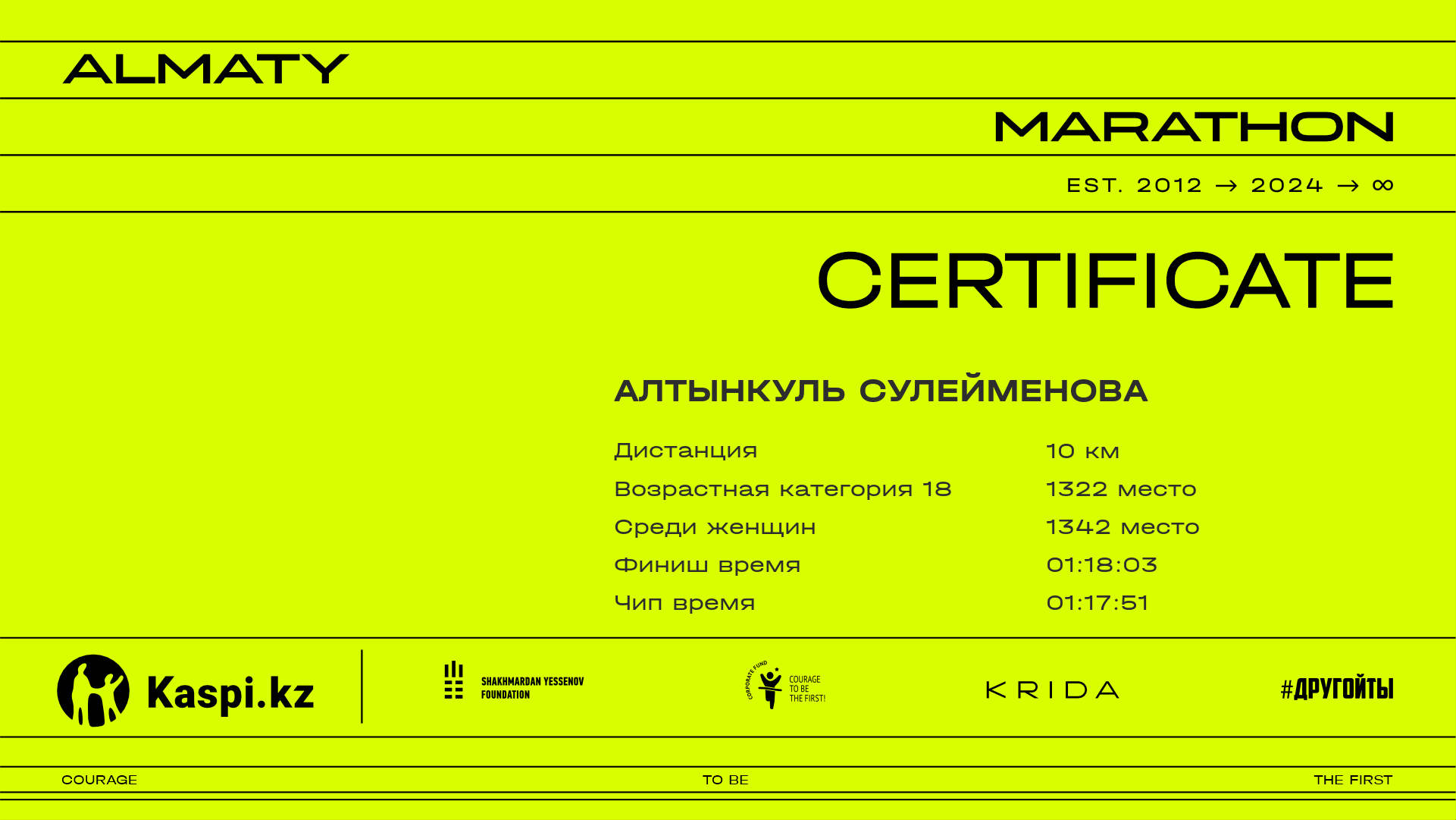 | 3661 | Алтынкуль Сулейменова | ![]() | Алматы | 4314 | 00:55:20.09 | 01:18:03.43 | 01:17:51.53 | Скачать |