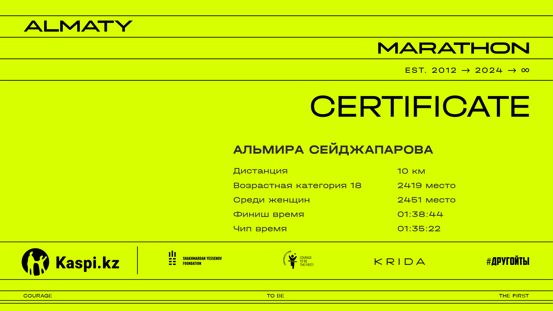 | 5254 | Альмира Сейджапарова | ![]() | Almaty | 5305 | 01:15:45.75 | 01:38:44.76 | 01:35:22.83 | Скачать |