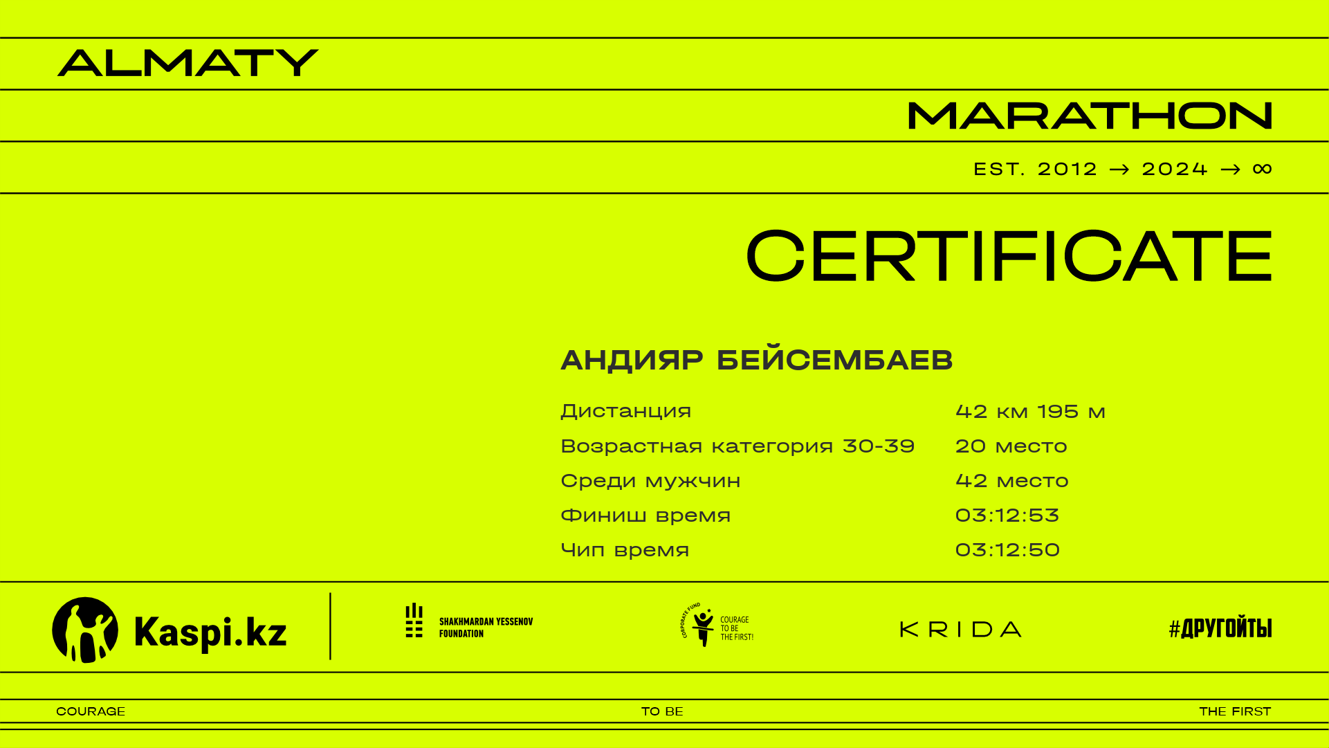 | 60 | Ерболат Омирзаков | ![]() | Алматы | 35 | 00:42:12.07 | 00:56:37.10 | 01:30:40.81 | 01:36:05.66 | 02:20:42.27 | 03:19:15.30 | 03:19:13.20 | Скачать |