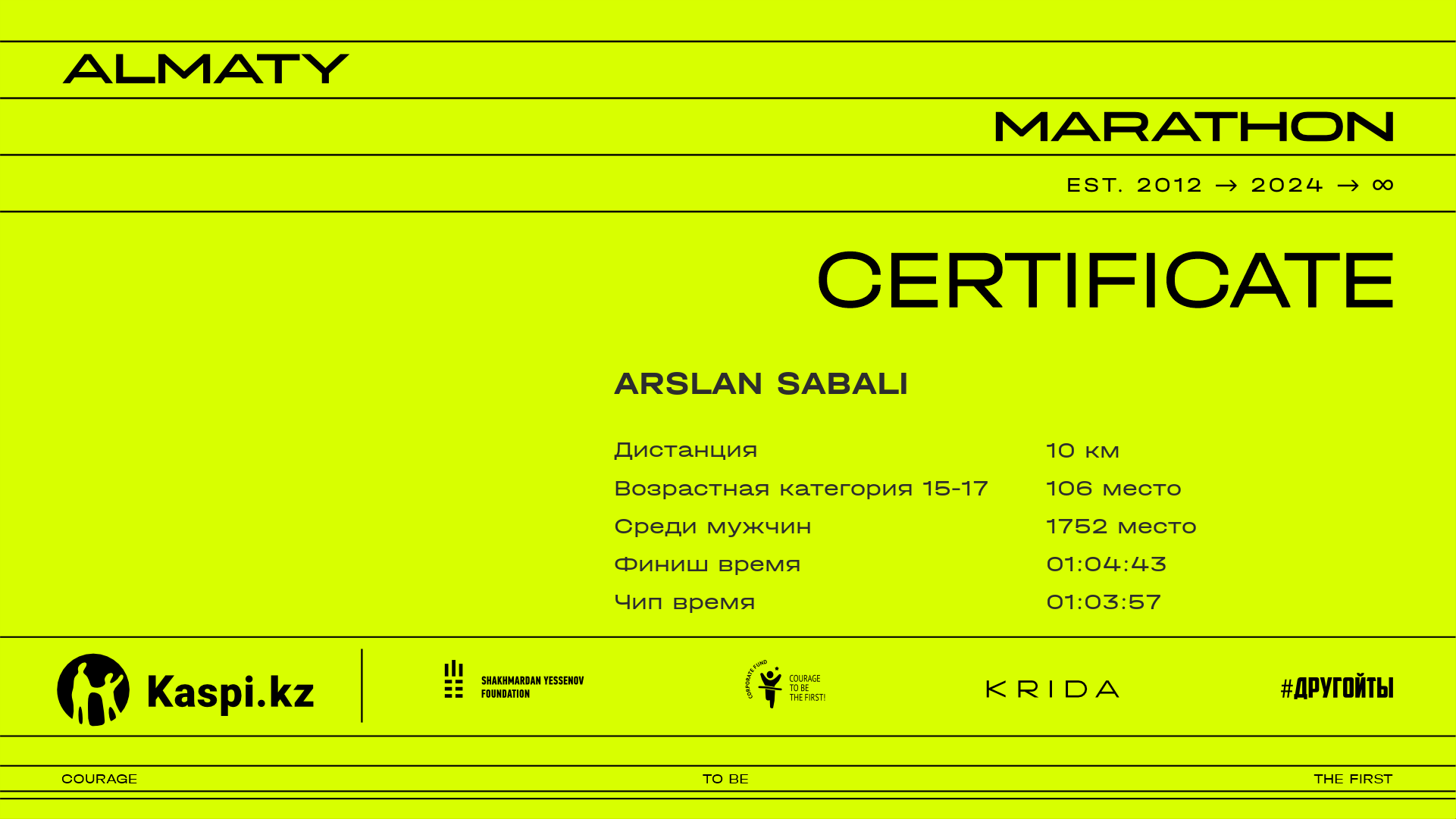 | 2269 | Arslan Sabali | ![]() | Алматы | 9073 | 00:56:19.74 | 01:04:43.94 | 01:03:57.41 | Скачать |