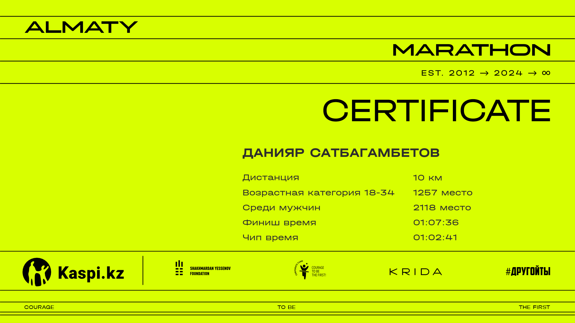 | 2826 | ДАРЫН СЕЙДАХМЕТОВ | ![]() | КОНАЕВ | 13947 | 00:59:55.17 | 01:07:36.61 | 01:05:19.33 | Скачать |