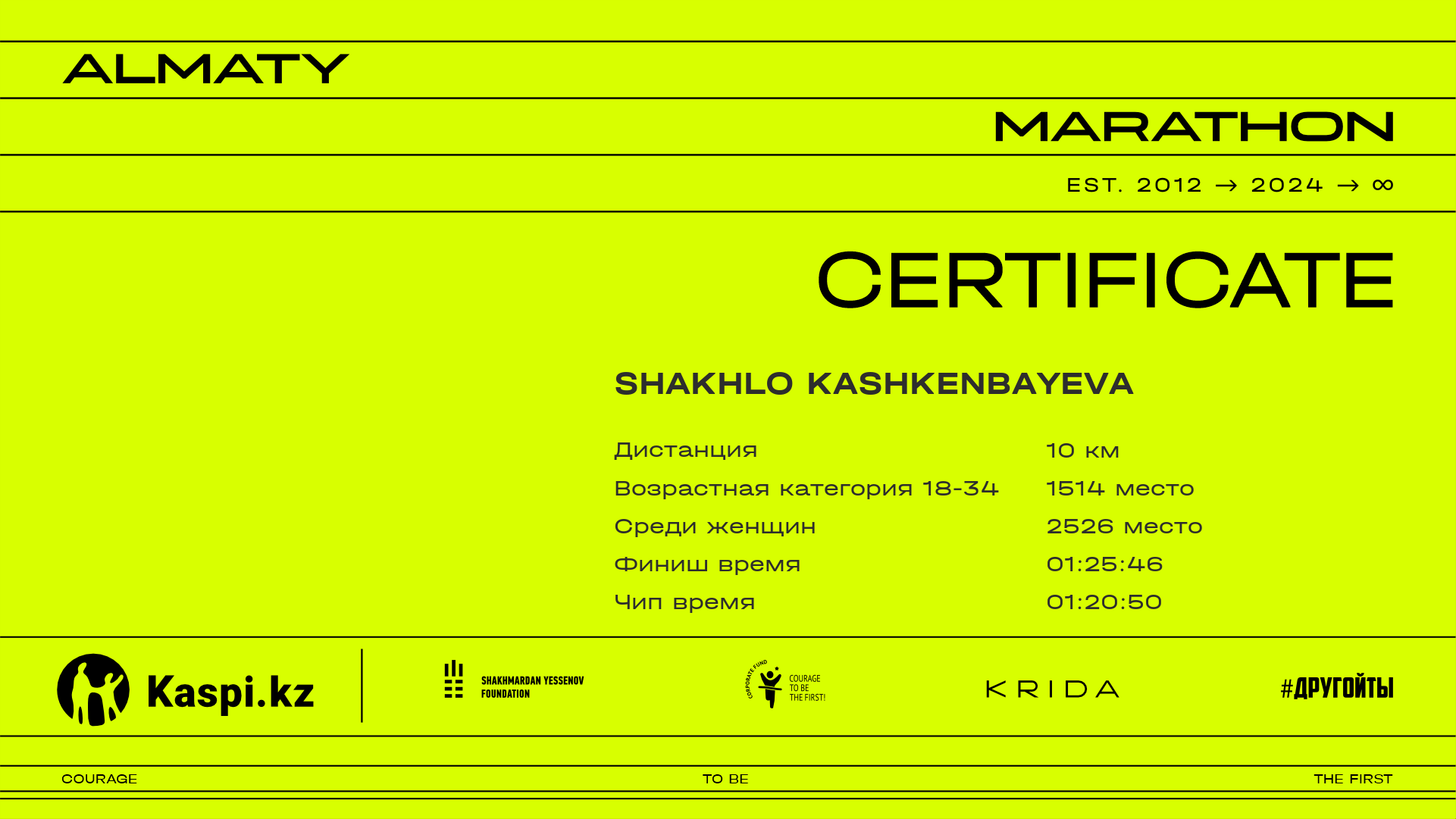 | 6359 | Денис Юн | ![]() | Алматы | 10044 | 01:16:20.76 | 01:26:19.77 | 01:22:42.96 | Скачать |