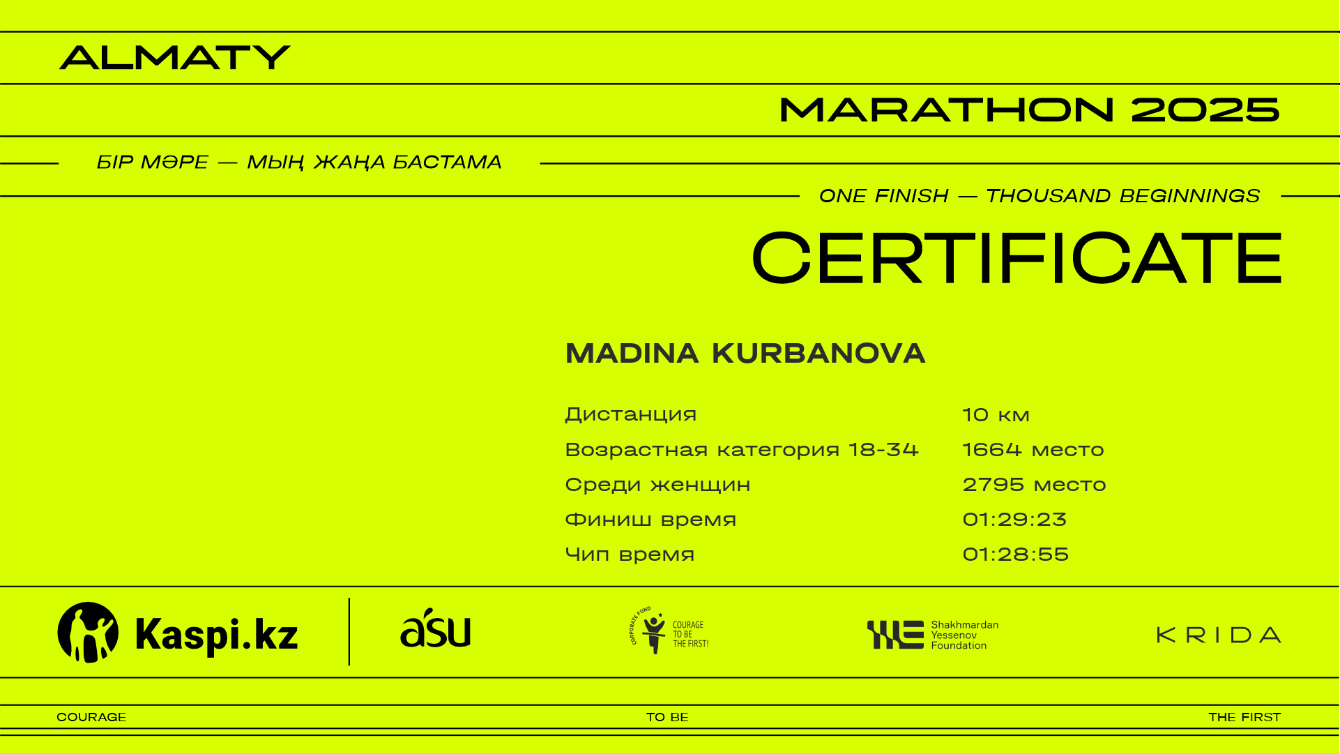 | 5882 | Madina Kurbanova | ![]() | Алматы | 14118 | 01:18:26 | 01:29:23 | 01:28:55 | Скачать |