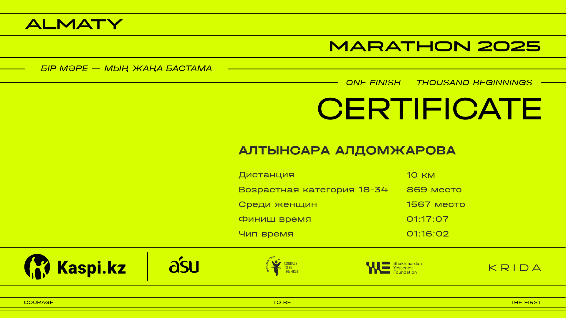 | 4933 | Динара Устемирова | ![]() | Алматы | 9773 | 01:11:00 | 01:22:47 | 01:21:02 | Скачать |