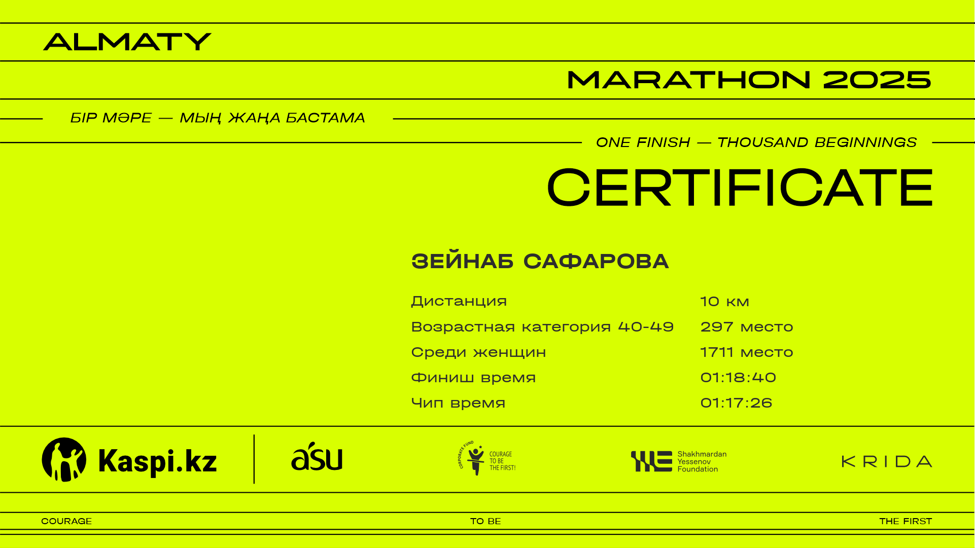 | 4353 | Зейнаб Сафарова | ![]() | Алматы | 10479 | 01:07:46 | 01:18:40 | 01:17:26 | Скачать |