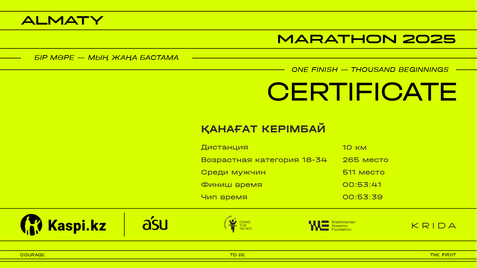 | 627 | Қанағат Керімбай | ![]() | Алматы | 7892 | 00:47:00 | 00:53:41 | 00:53:39 | Скачать |