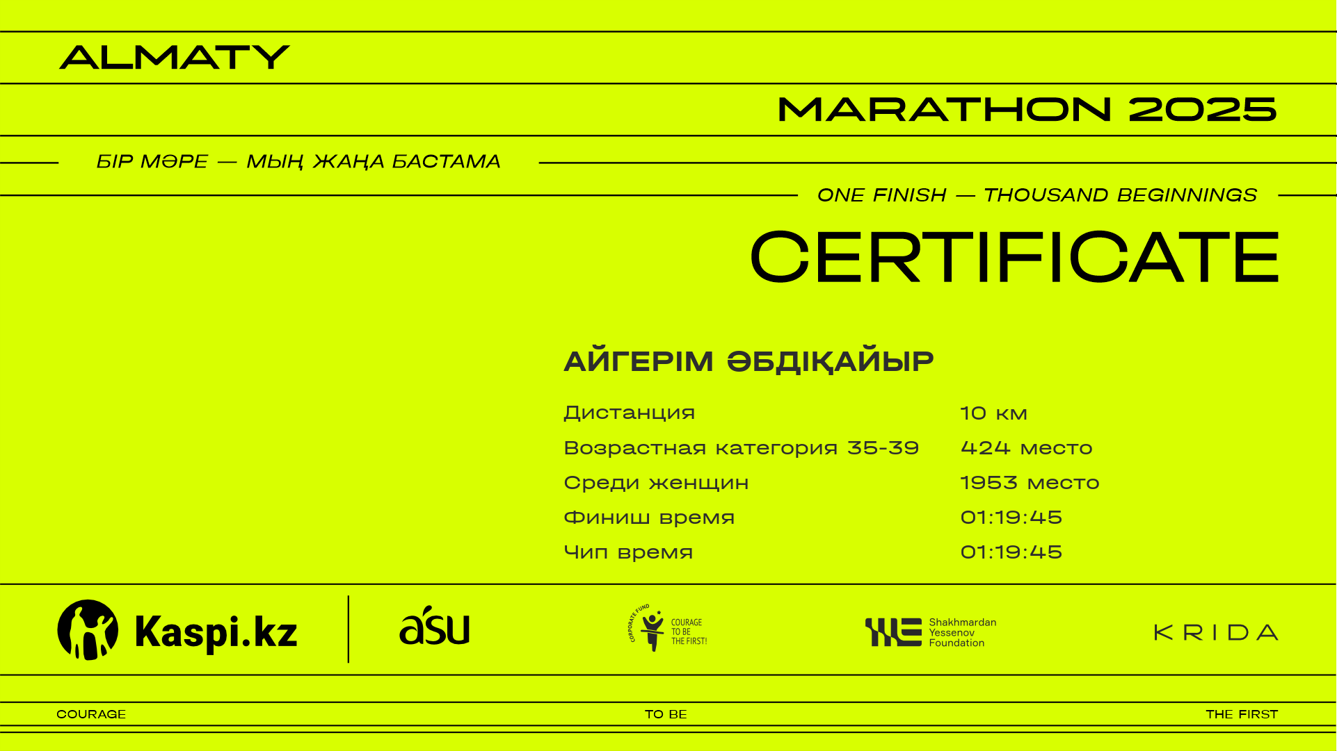 | 4907 | Tani Kazhgaliyeva | ![]() | Алматы | 11598 | 01:10:49 | 01:20:50 | 01:20:47 | Скачать |