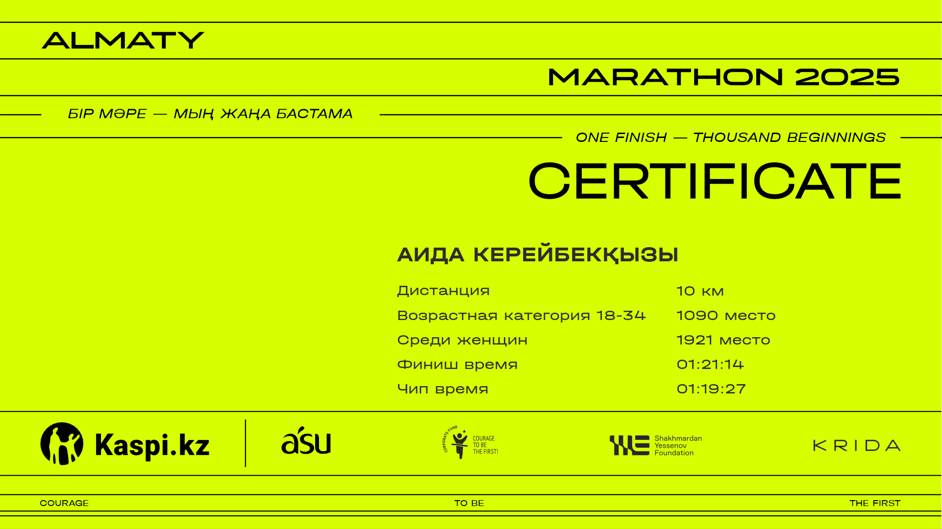| 5023 | Zhuldyz Tauassarova | ![]() | Алматы | 13741 | 01:11:29 | 01:21:59 | 01:21:41 | Скачать |