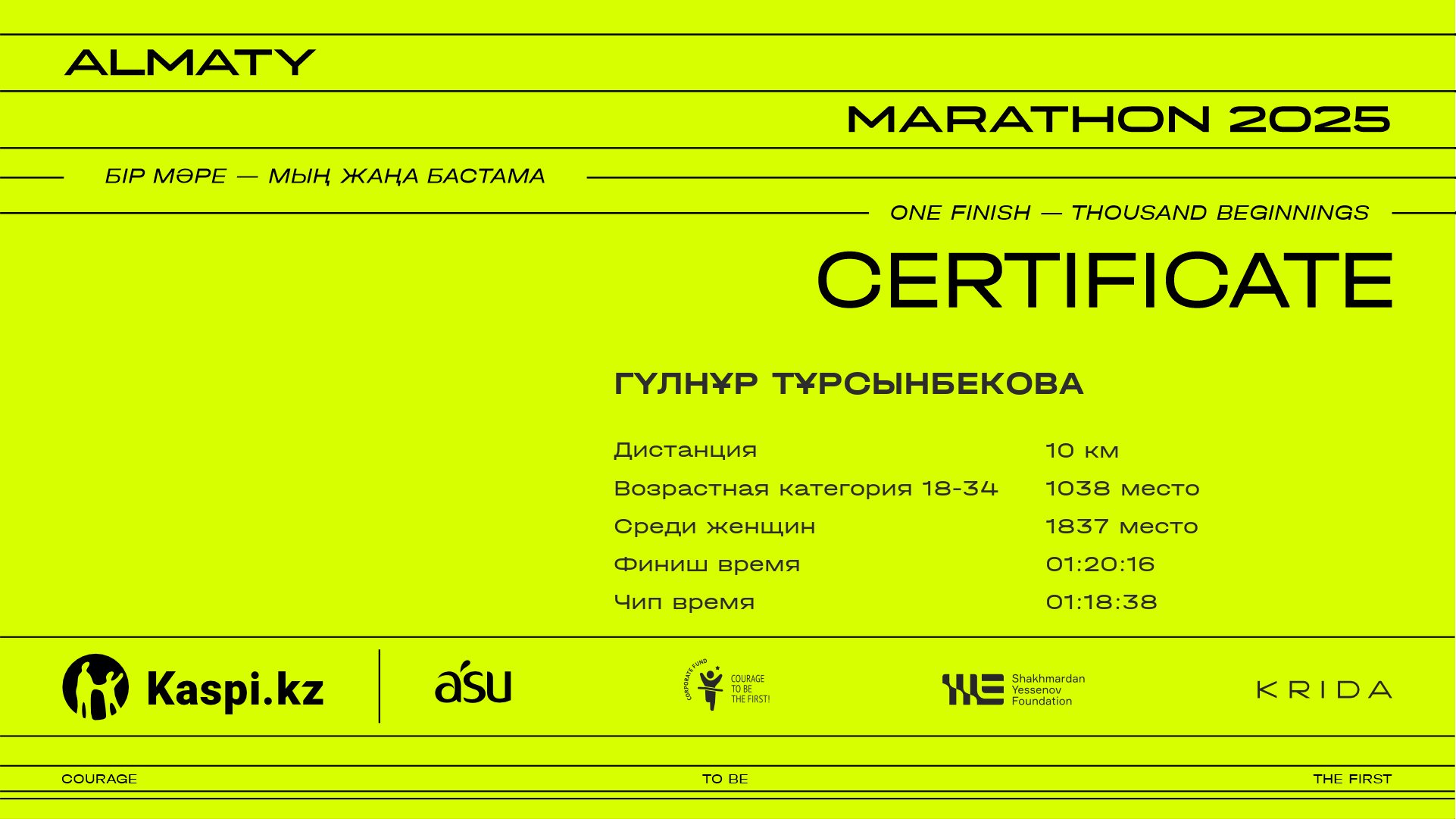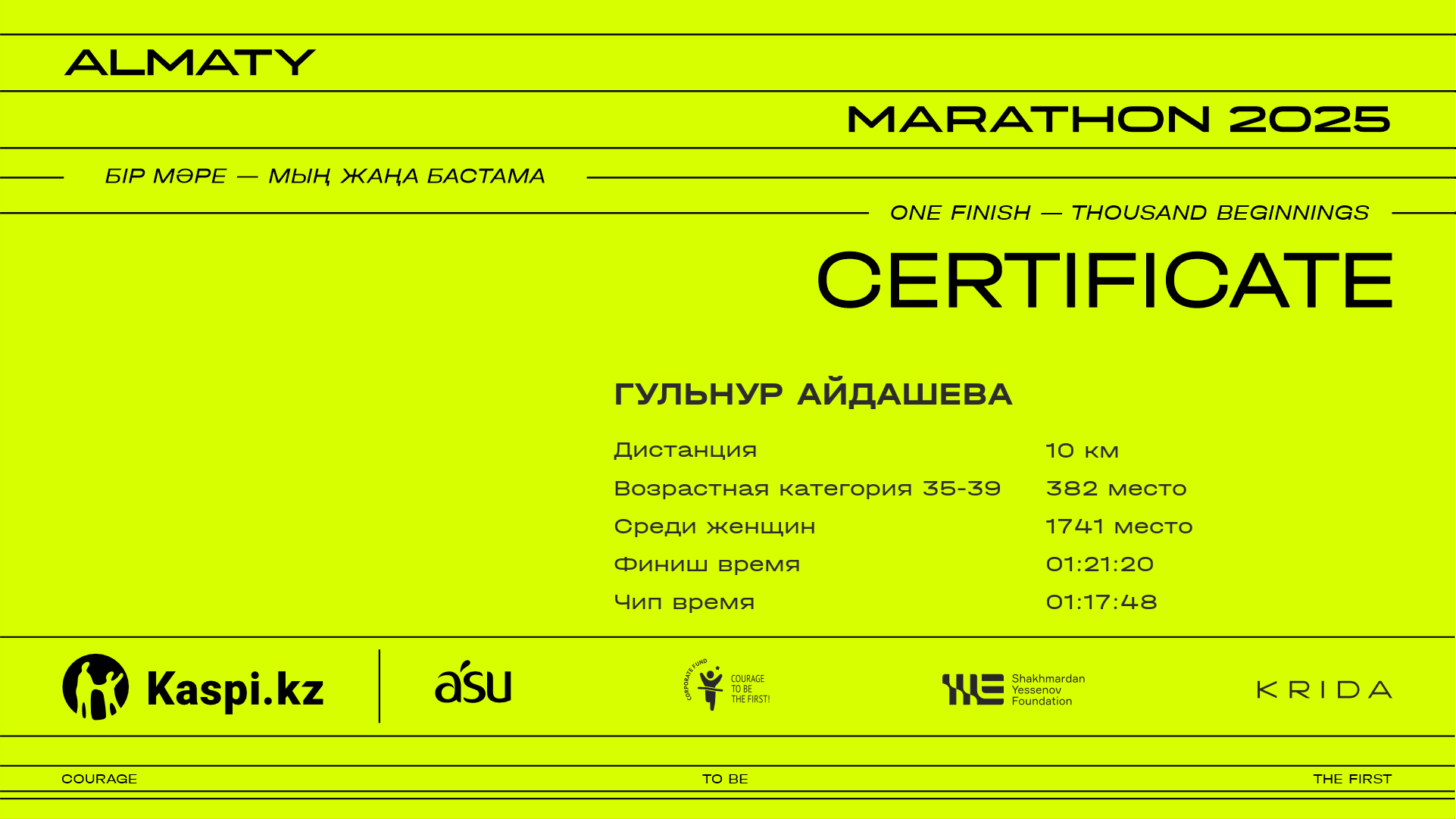 | 6078 | Айман Шидербаева | ![]() | Алматы | 10081 | 01:20:38 | 01:33:40 | 01:31:28 | Скачать |