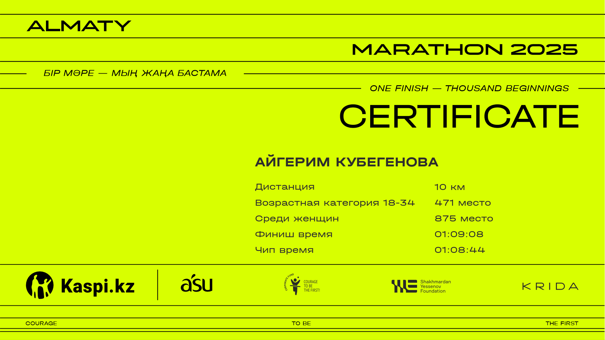 | 2851 | Айгерим Кубегенова | ![]() | Актобе | 12036 | 00:59:36 | 01:09:08 | 01:08:44 | Скачать |