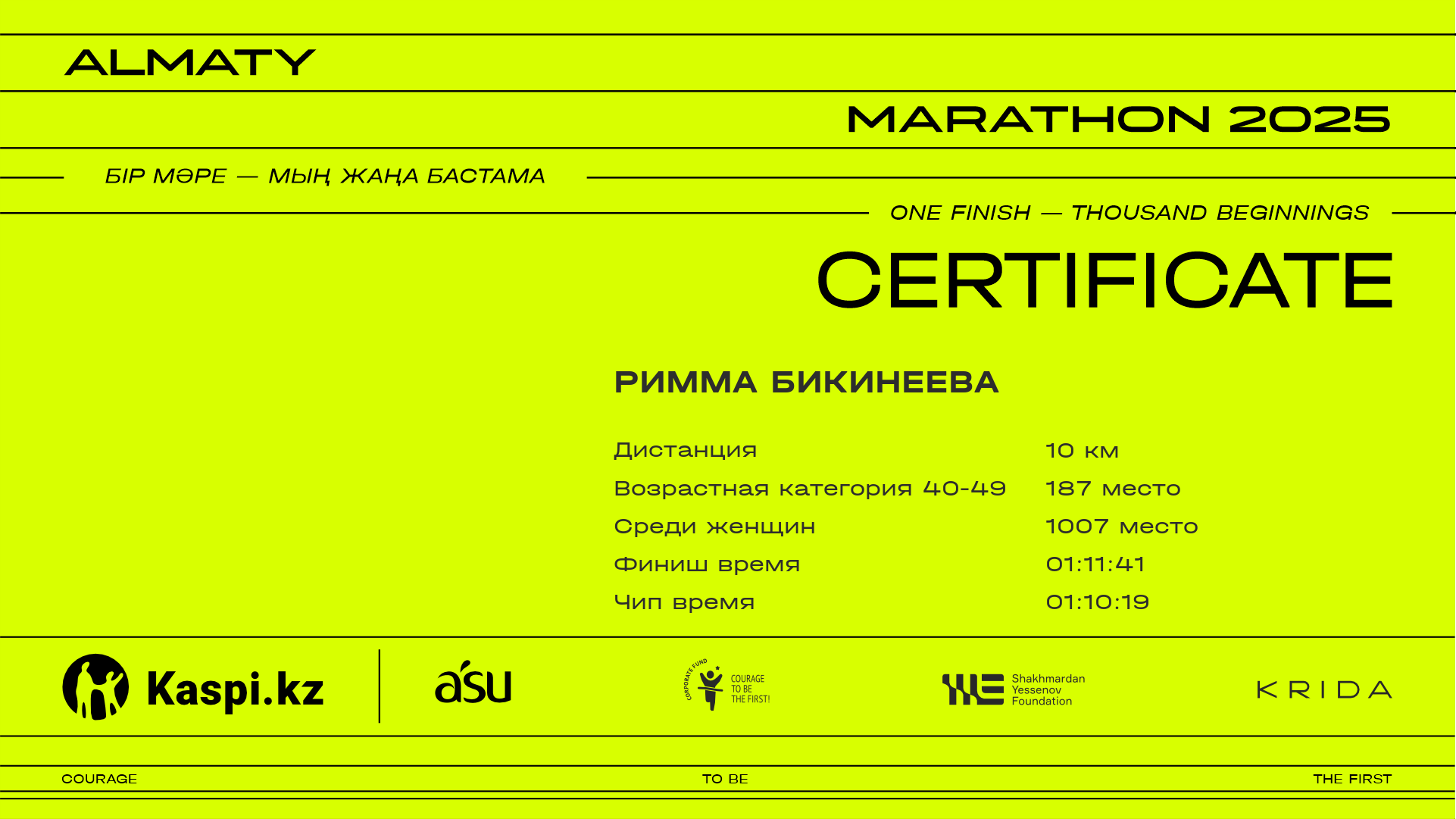 | 4162 | Рената Иванаева | ![]() | Алматы | 6263 | 01:07:37 | 01:19:57 | 01:16:20 | Скачать |