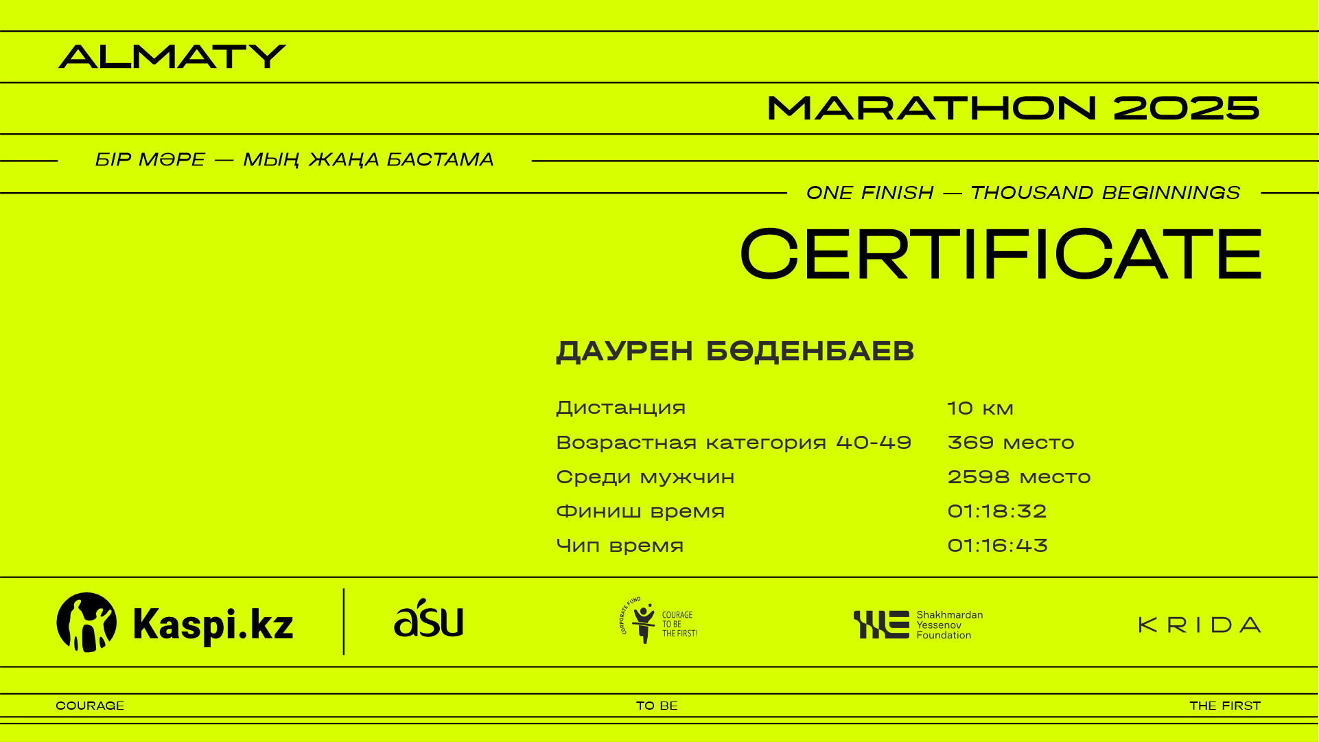 | 4236 | Даурен Бөденбаев | ![]() | Алматы | 13676 | 01:06:49 | 01:18:32 | 01:16:43 | Скачать |