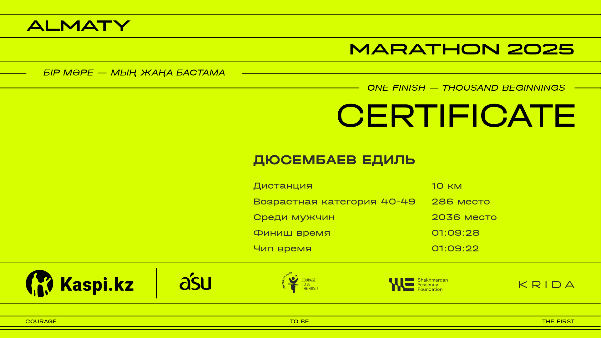 | 7028 | Ермек Aбишев | ![]() | Алматы | 15148 | 01:44:11 | 01:58:38 | 01:56:28 | Скачать |