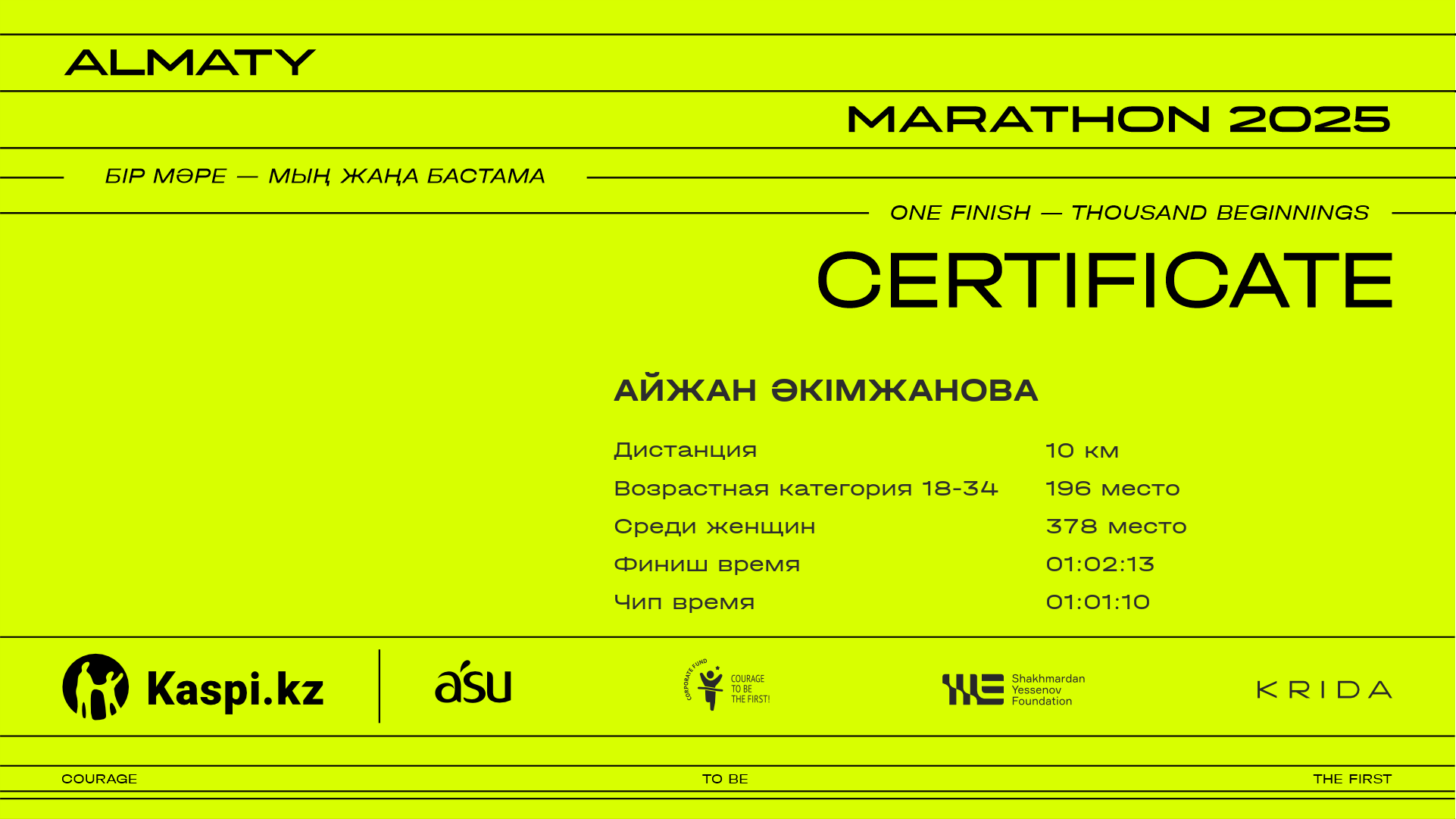 | 1586 | Гузалия Боскумбаева | ![]() | Астана | 8061 | 00:52:44 | 01:01:13 | 01:00:58 | Скачать |