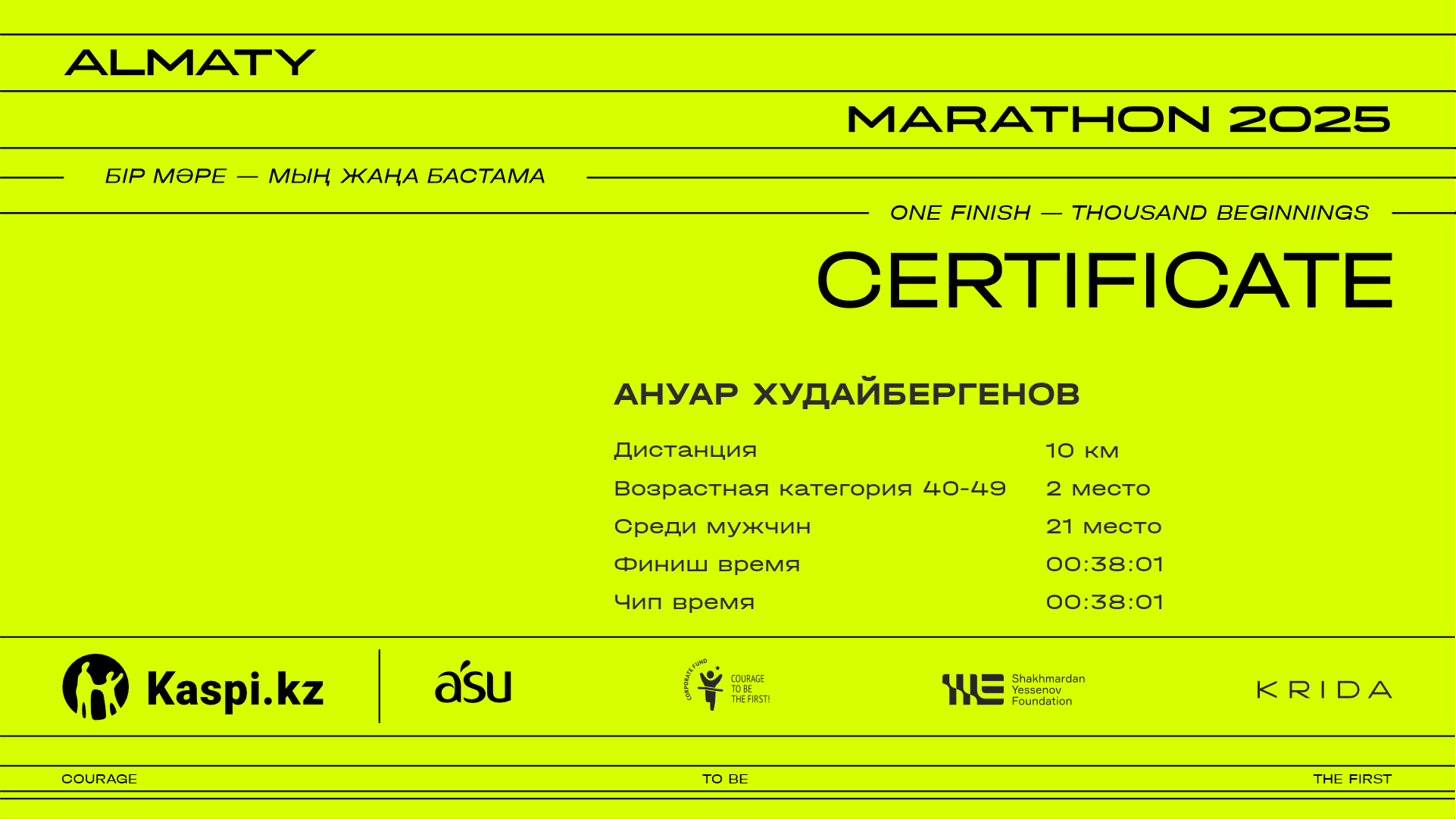| 6189 | Алмас Джумагалиев | ![]() | Алматы | 8228 | 01:20:38 | 01:33:15 | 01:32:51 | Скачать |