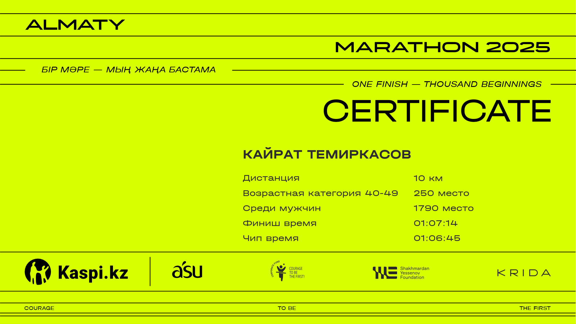 | 2503 | Кайрат Темиркасов | ![]() | Актау | 9296 | 00:58:06 | 01:07:14 | 01:06:45 | Скачать |