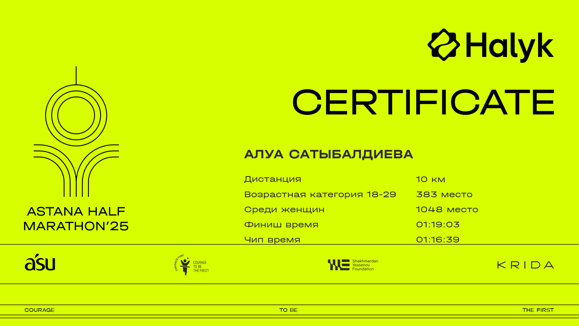 | 3723 | Alina Beisikenova | ![]() | Астана | 3013 | 01:06:43 | 01:48:08 | 01:45:04 | Скачать |
