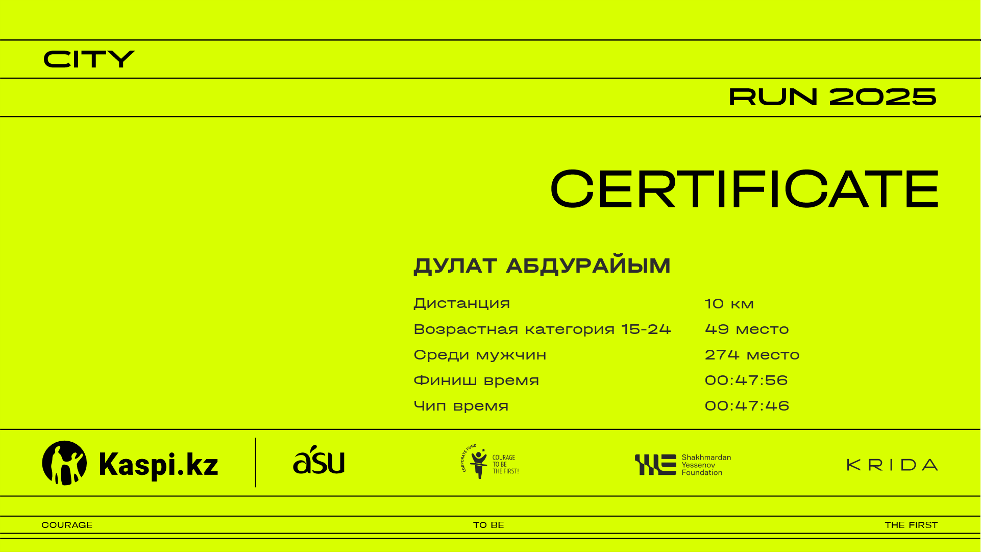 | 308 | Nikita Kostenko | ![]() | Almati | 1003 | 00:12:22 | 00:20:53 | 00:30:16 | 00:39:51 | 00:46:54 | 00:47:54 | 00:47:41 | Скачать |