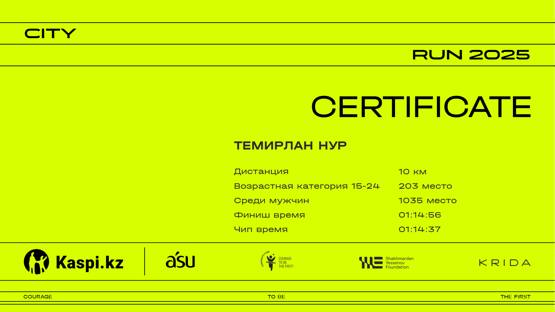 | 1573 | Ербол Игембергенов | ![]() | Алматы | 2152 | 00:23:49 | 00:37:02 | 00:49:32 | 01:02:45 | 01:13:07 | 01:14:31 | 01:13:29 | Скачать |